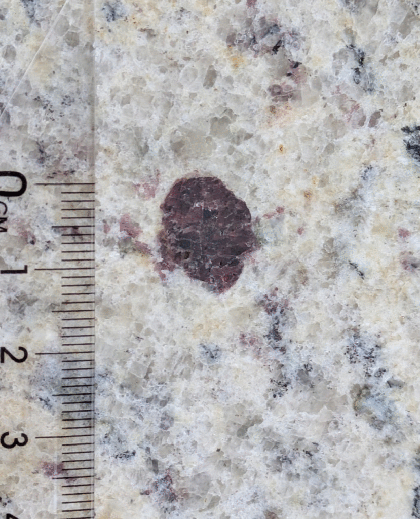 左側は虎ノ門病院のビルです。(2)と(3)は外壁の一部です。赤いガーネット(ザクロ石)が見られます。石材はブラジル産のサモアでしょうか…🧐