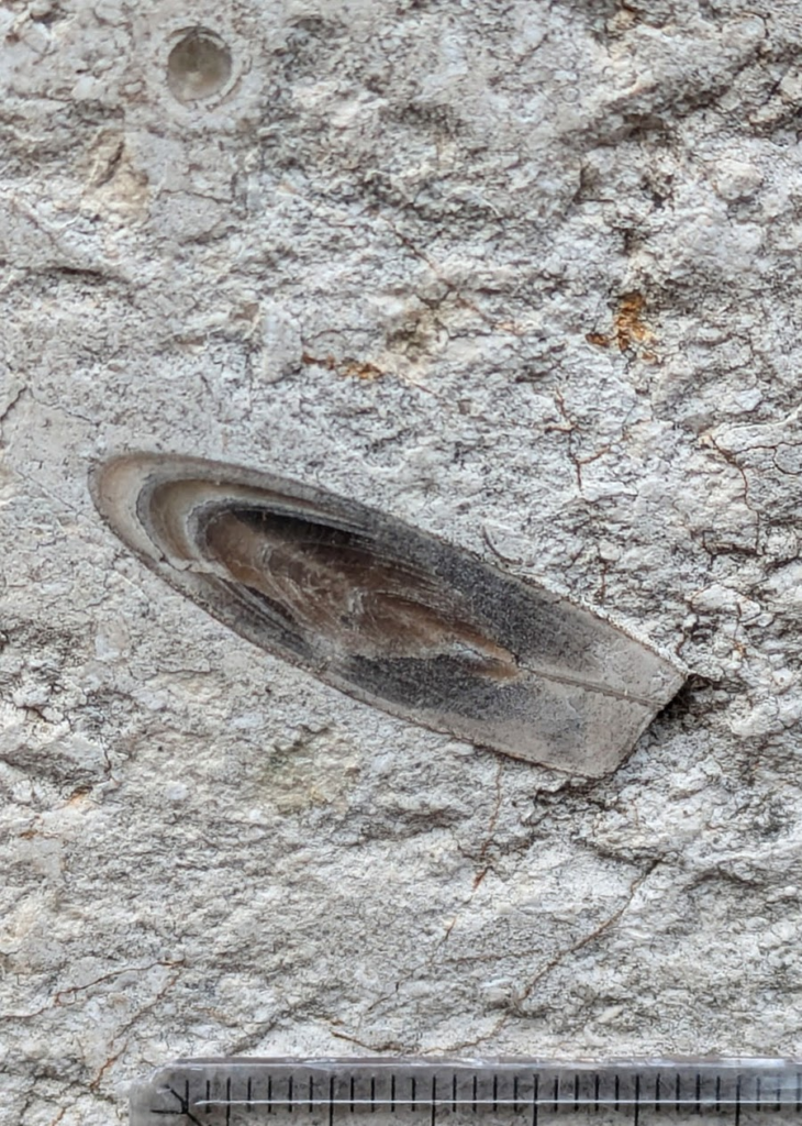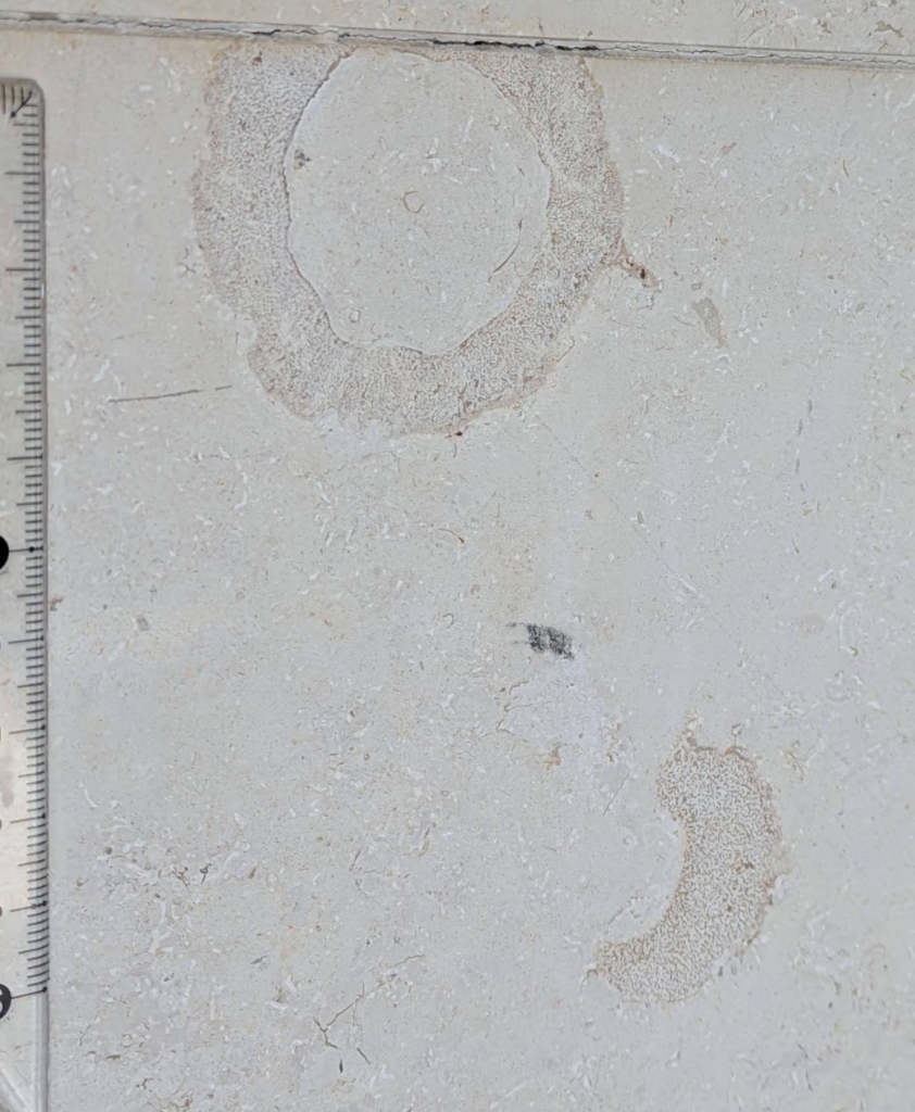 上の(1)の↑が(4)です。カイメンとアンモナイトがあります。屋外なので経年変化はありますが、(5)のように綺麗な円形で隔壁もよく見える形です🌀「はじめに」に書いた、既ポストの「花壇で頑張るアンモナイト」はこれです🌿