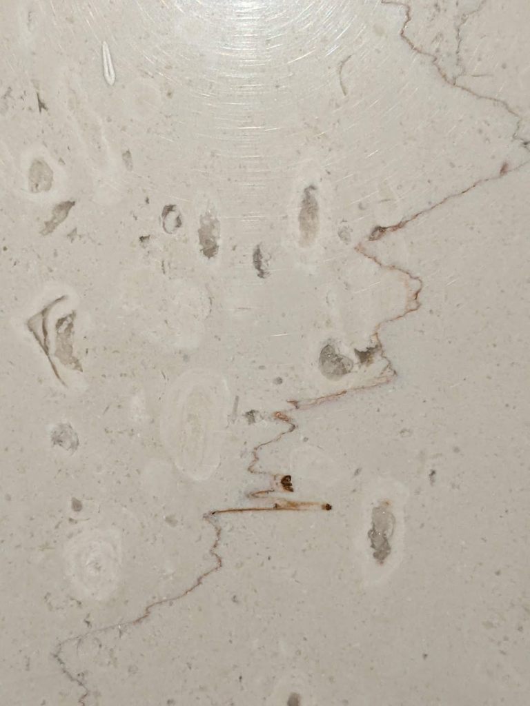 (9)の彫刻付近の窓際では(1)~(5)で見た物と同じシェルベージュ石材も使われていました。