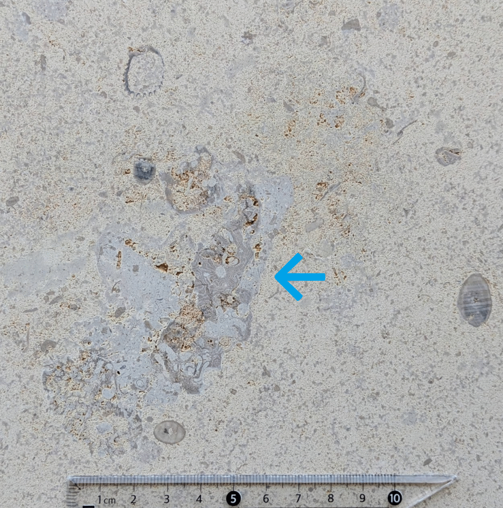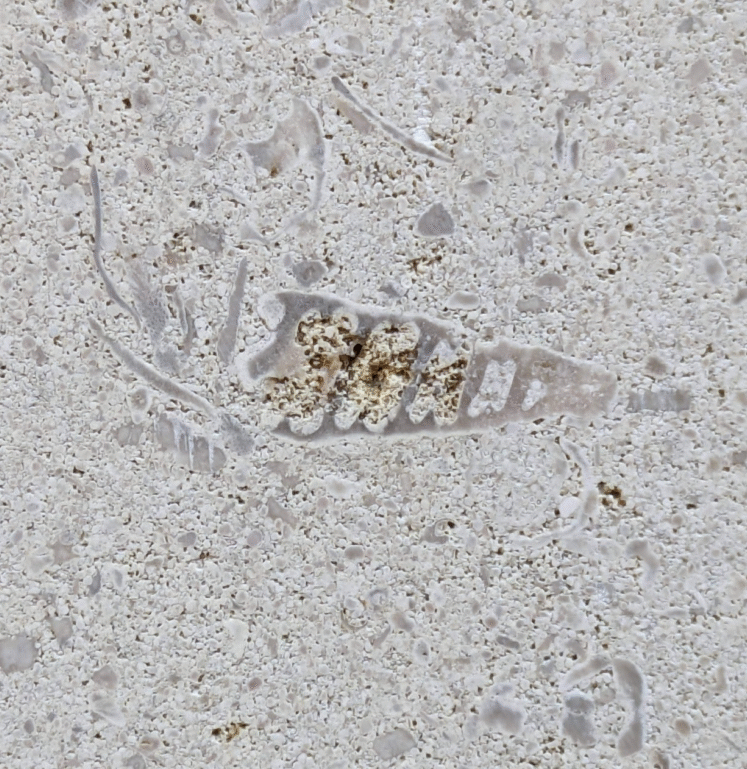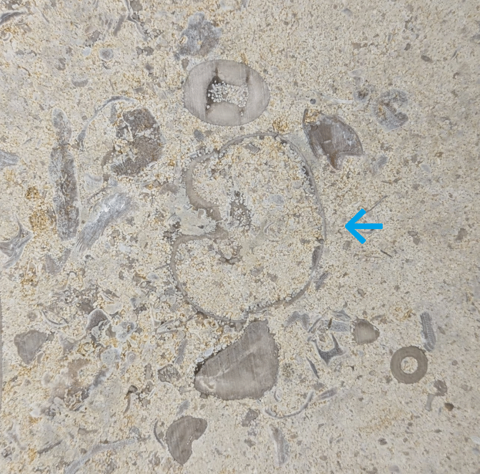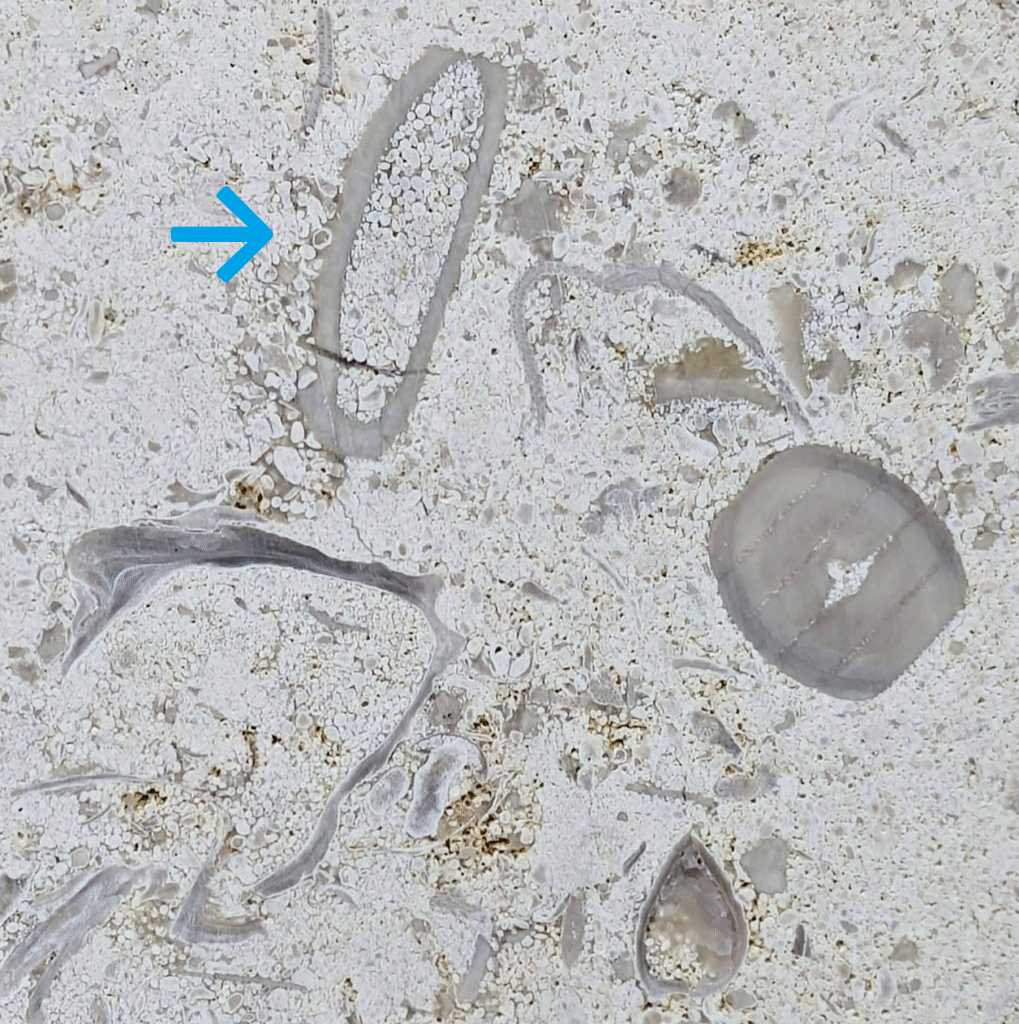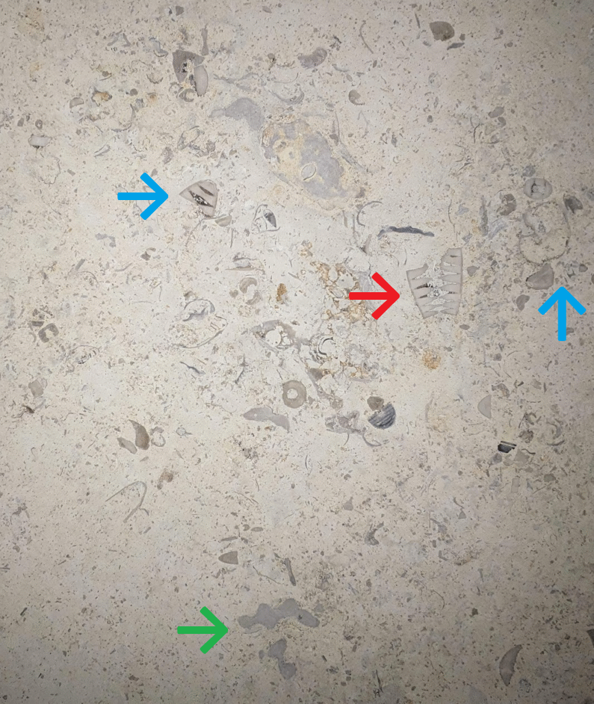 (1)のように、アーチ型にカーブした柱にも…-のウミユリ(2)、のコケムシ(3)…のように化石が見られます。