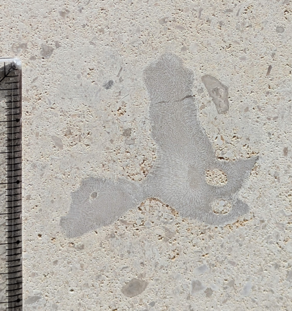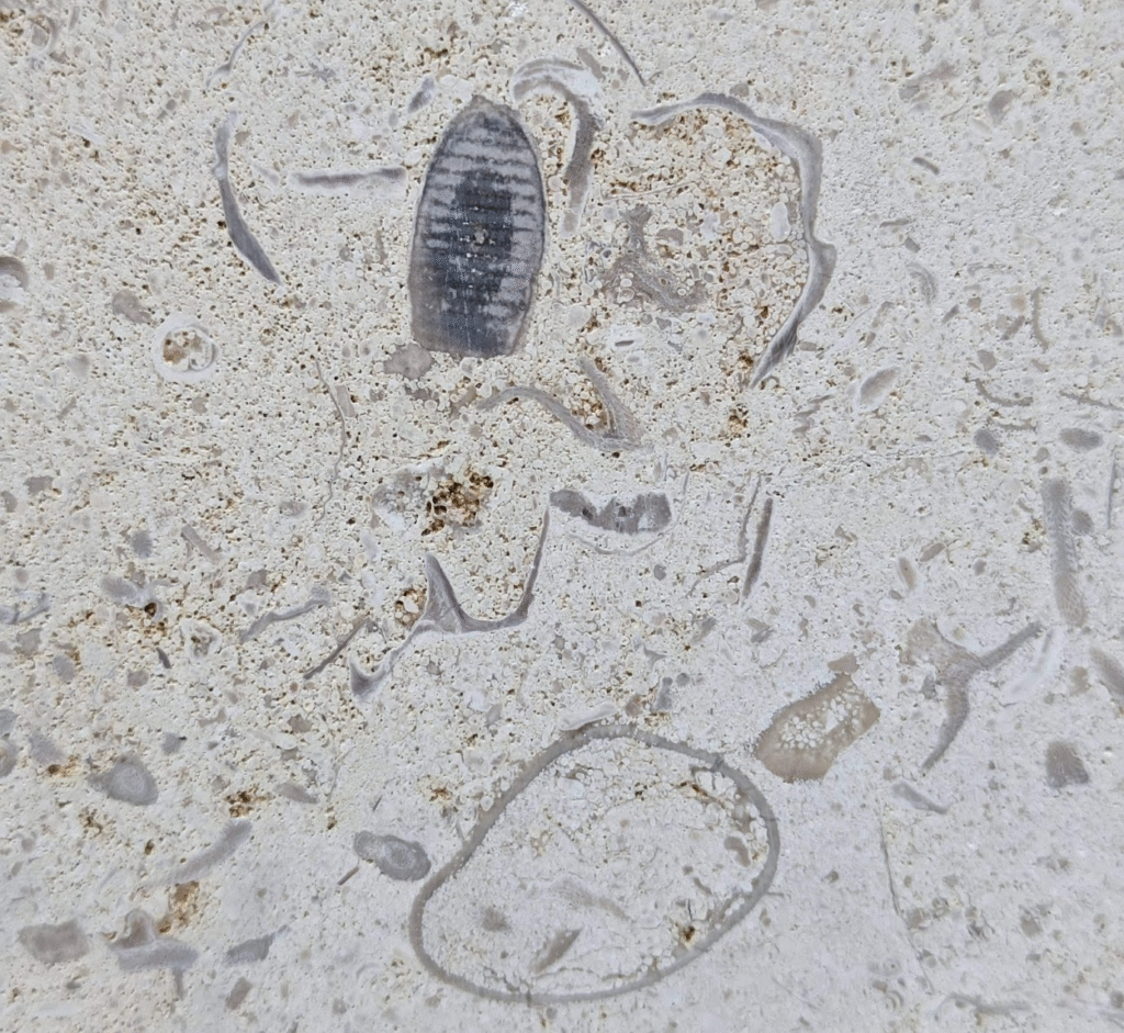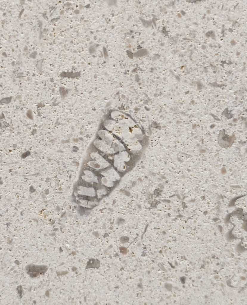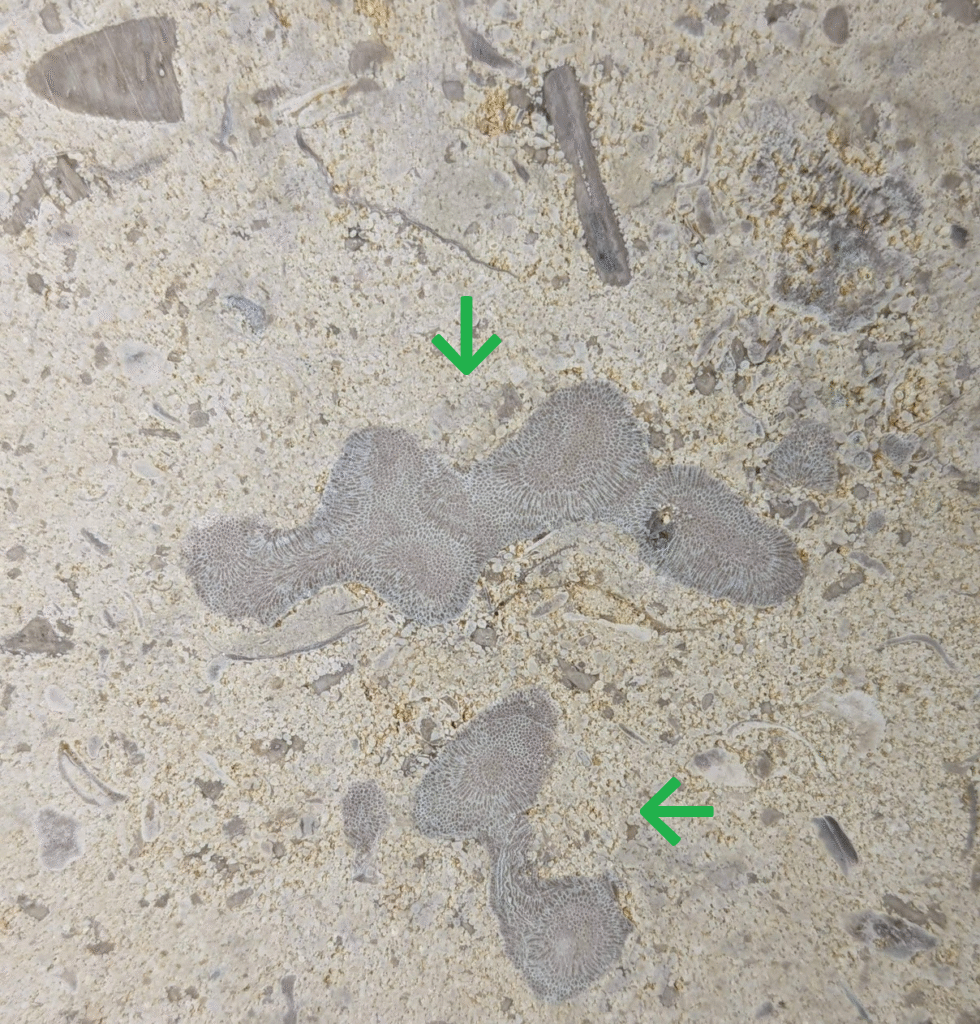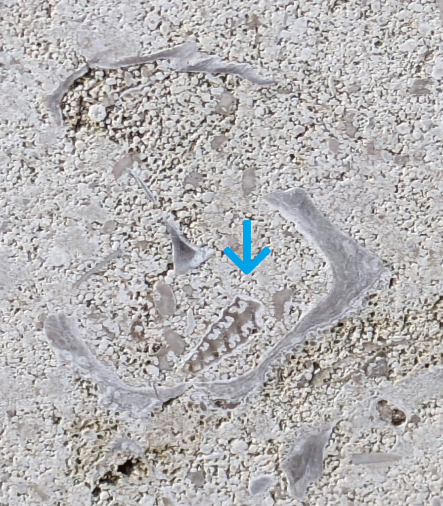 (1)のように、アーチ型にカーブした柱にも…-のウミユリ(2)、のコケムシ(3)…のように化石が見られます。