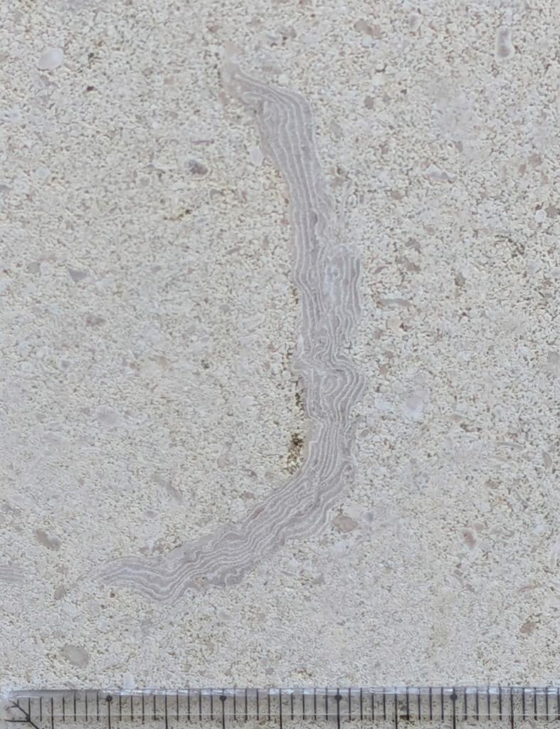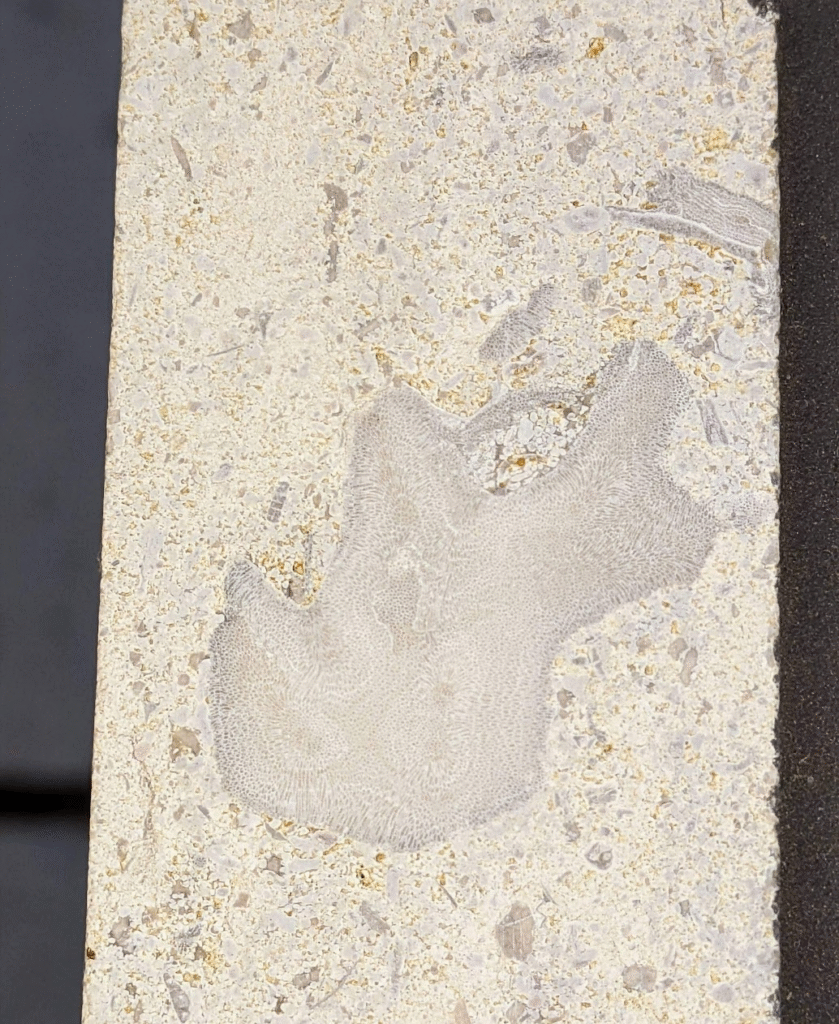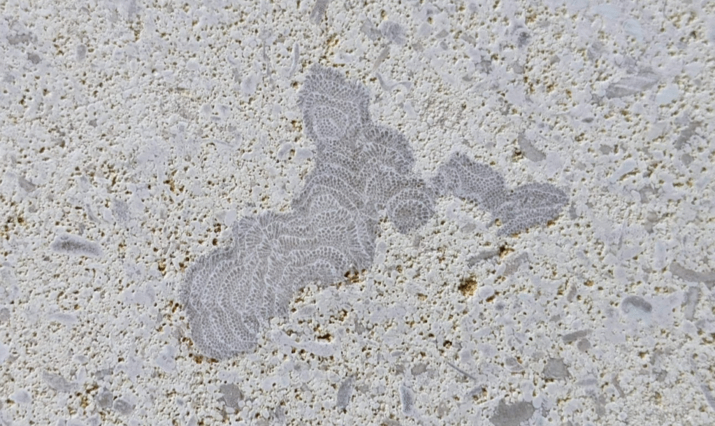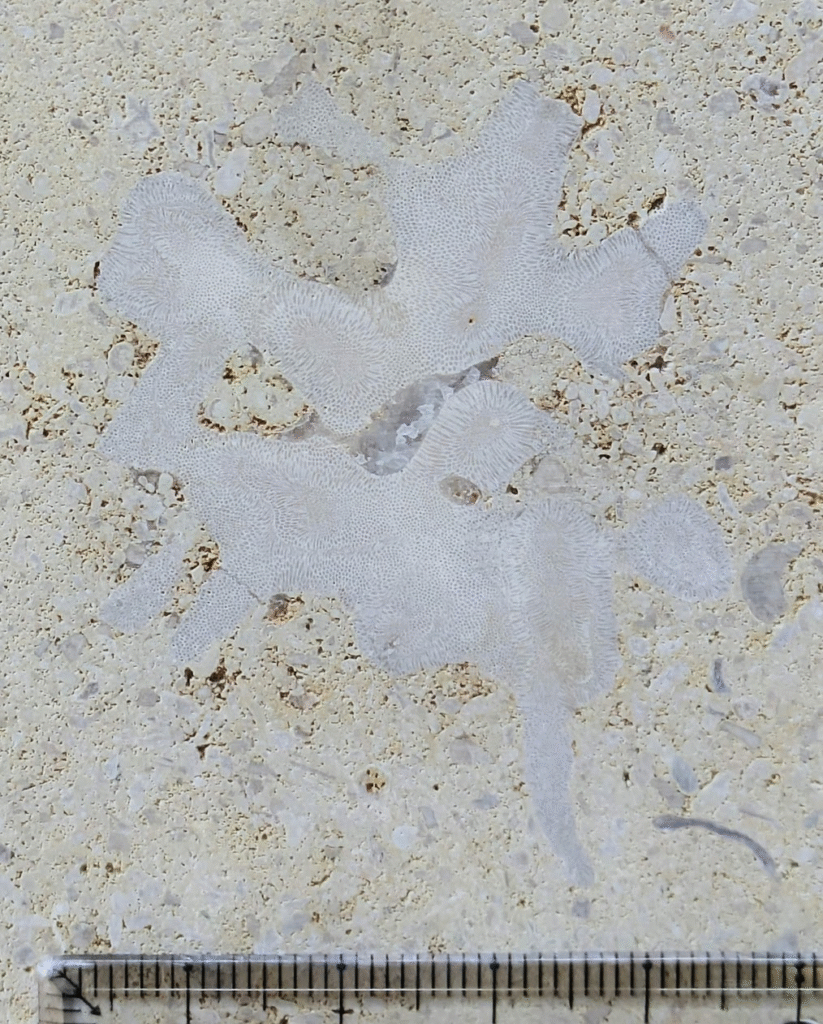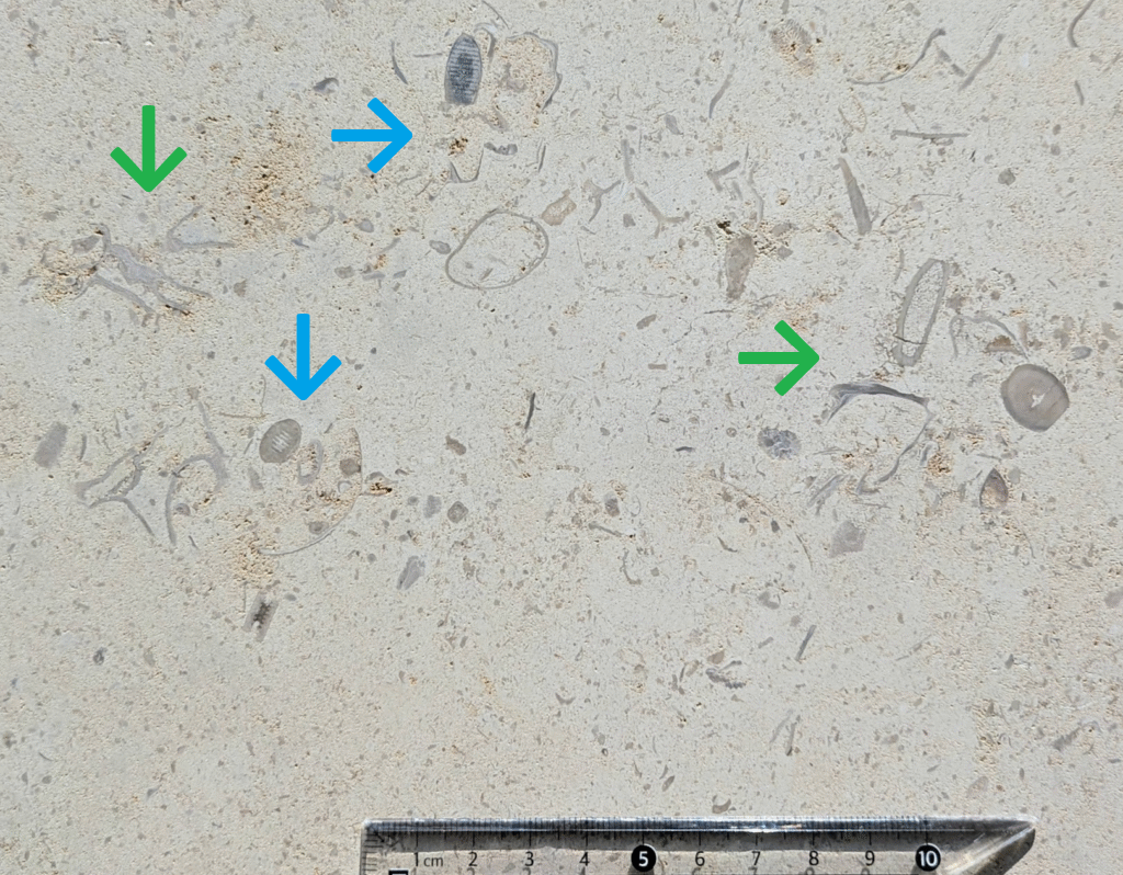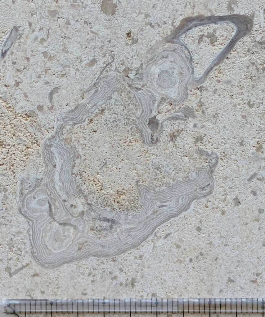(1)のように、アーチ型にカーブした柱にも…-のウミユリ(2)、のコケムシ(3)…のように化石が見られます。