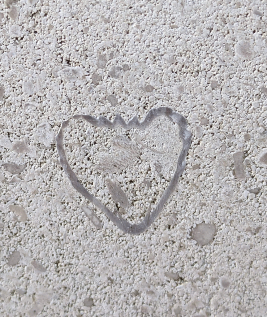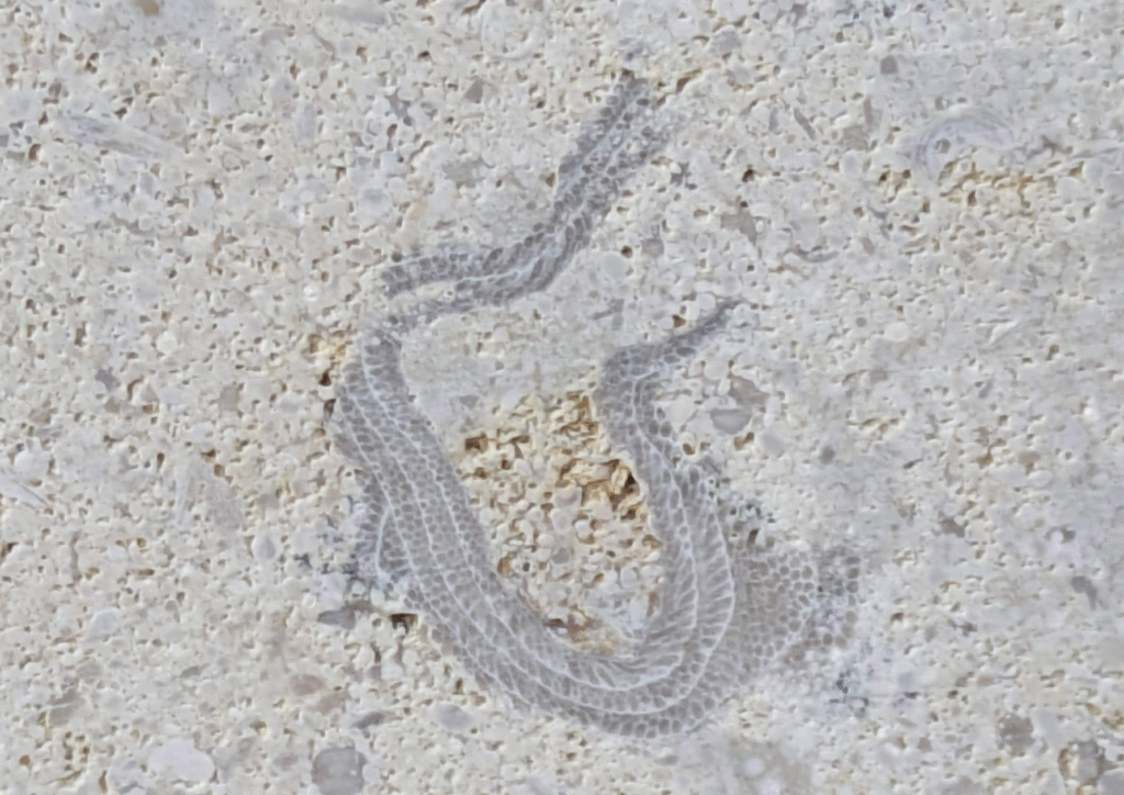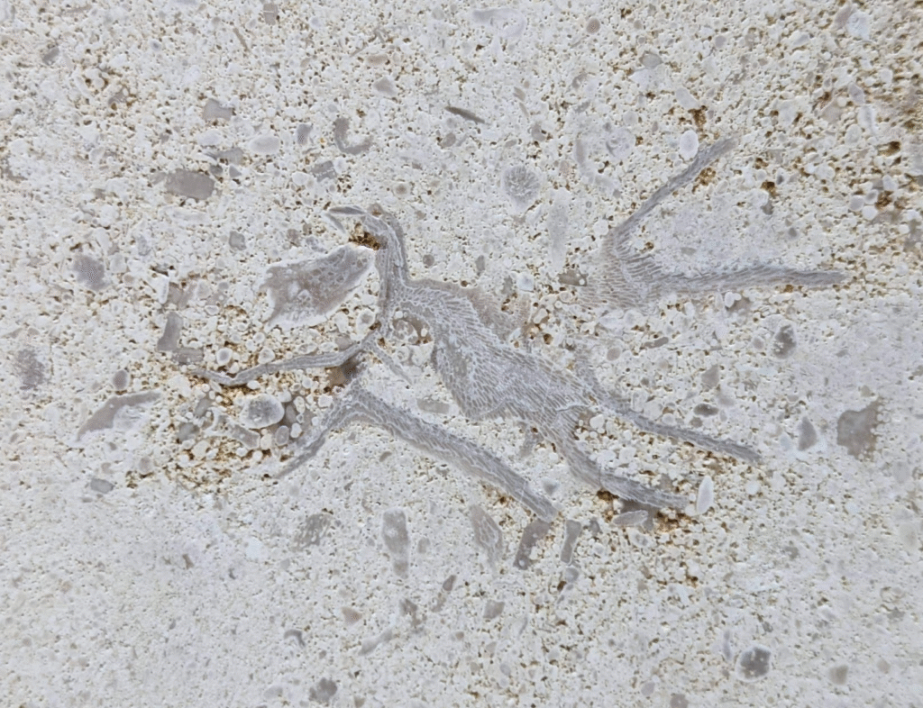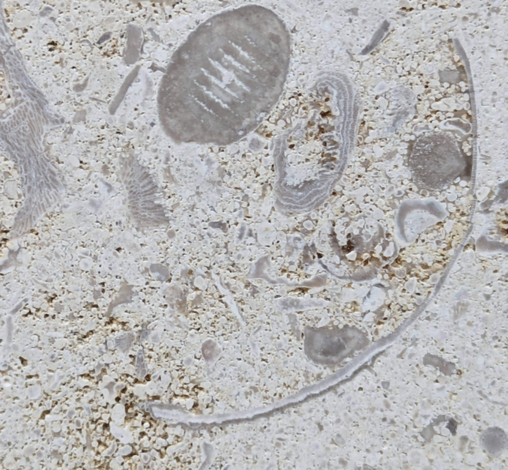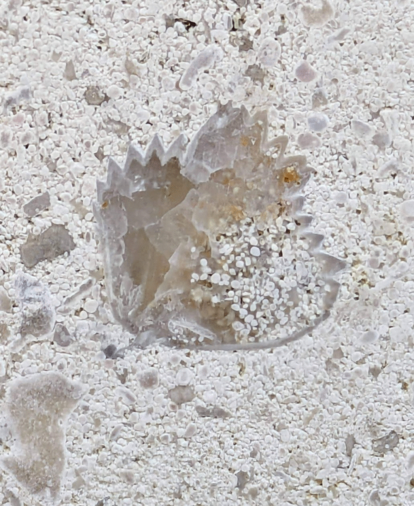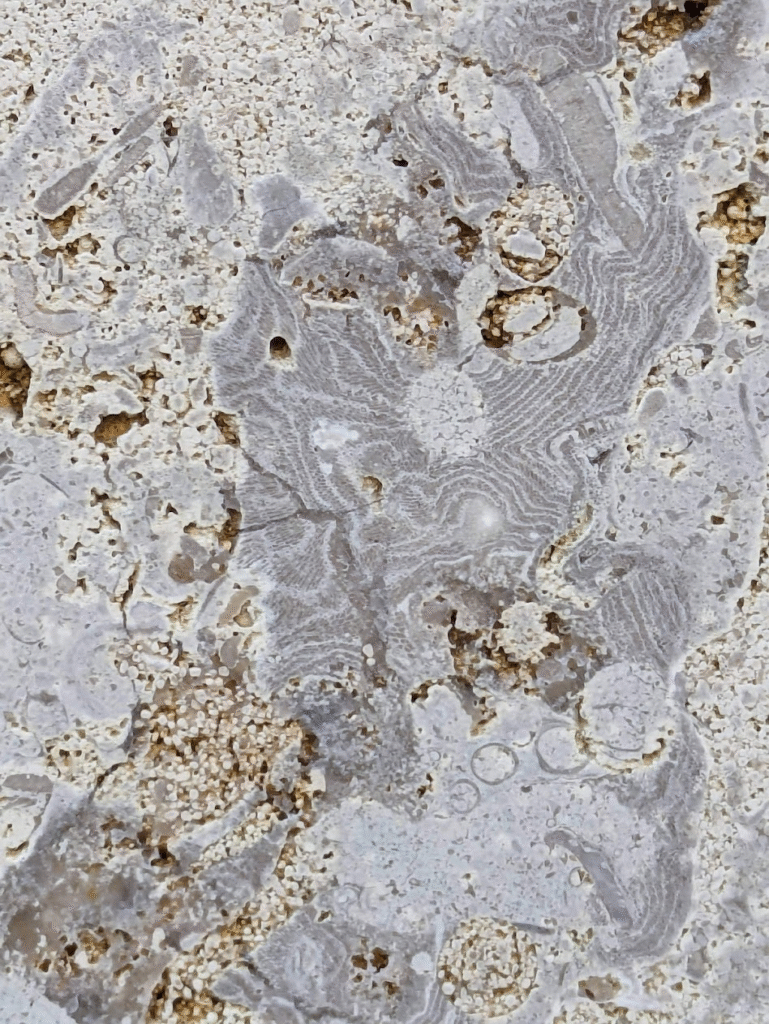 (1)のように、アーチ型にカーブした柱にも…-のウミユリ(2)、のコケムシ(3)…のように化石が見られます。