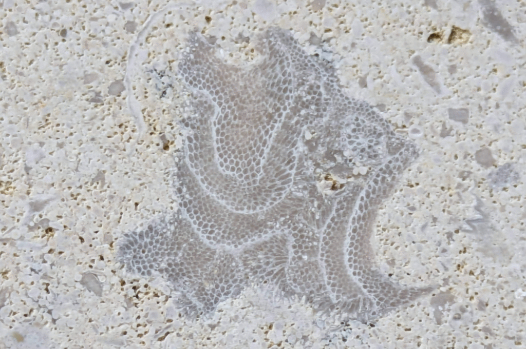 (1)のを拡大した物が(2)です。群体のコケムシ化石かと思われる部分が見られます。