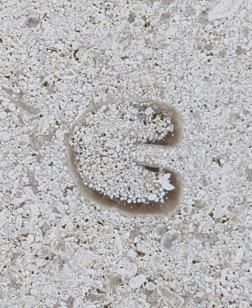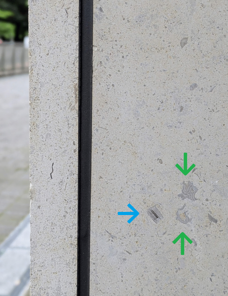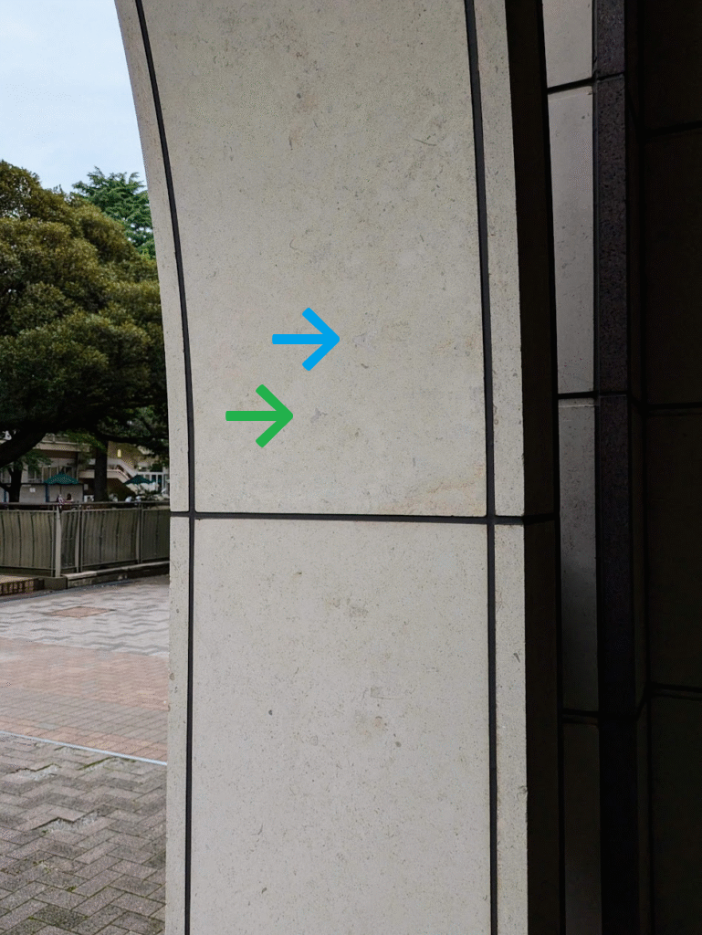 前編(こちら)に続き、学習院大学 目白キャンパス「西2号館」の外壁、フランス産 マッサンジ 石材(おそらく)に見られる化石についてです。