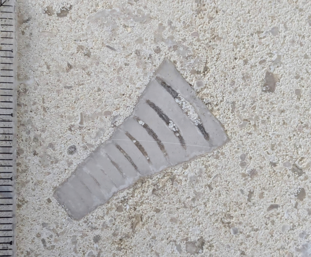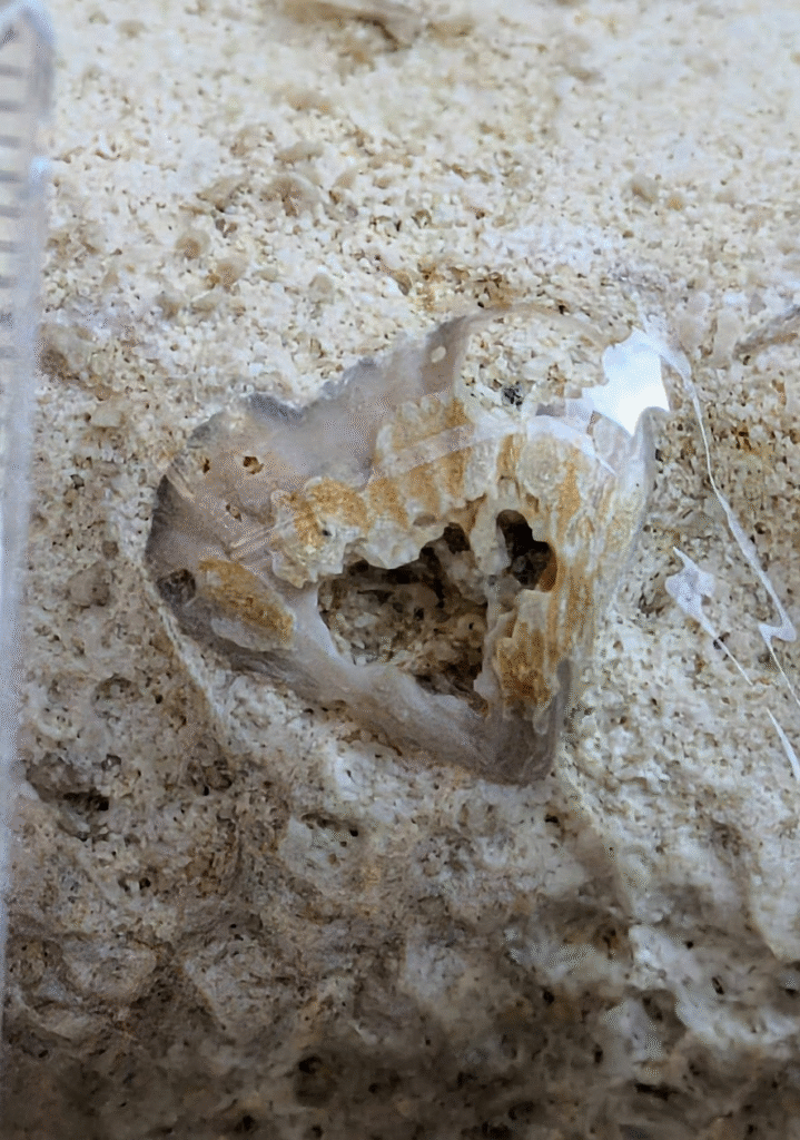 (13)も水平面から垂直面に落ちる部分にあった物です。腕足動物かと思います。