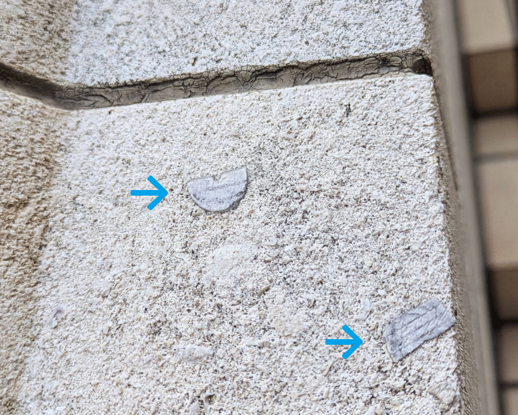 (1)はサンクンガーデンから上がる階段の壁の一部分です。←が(2)、←が(3)で、コケムシ個虫のいた細かな穴の群集が見られます。