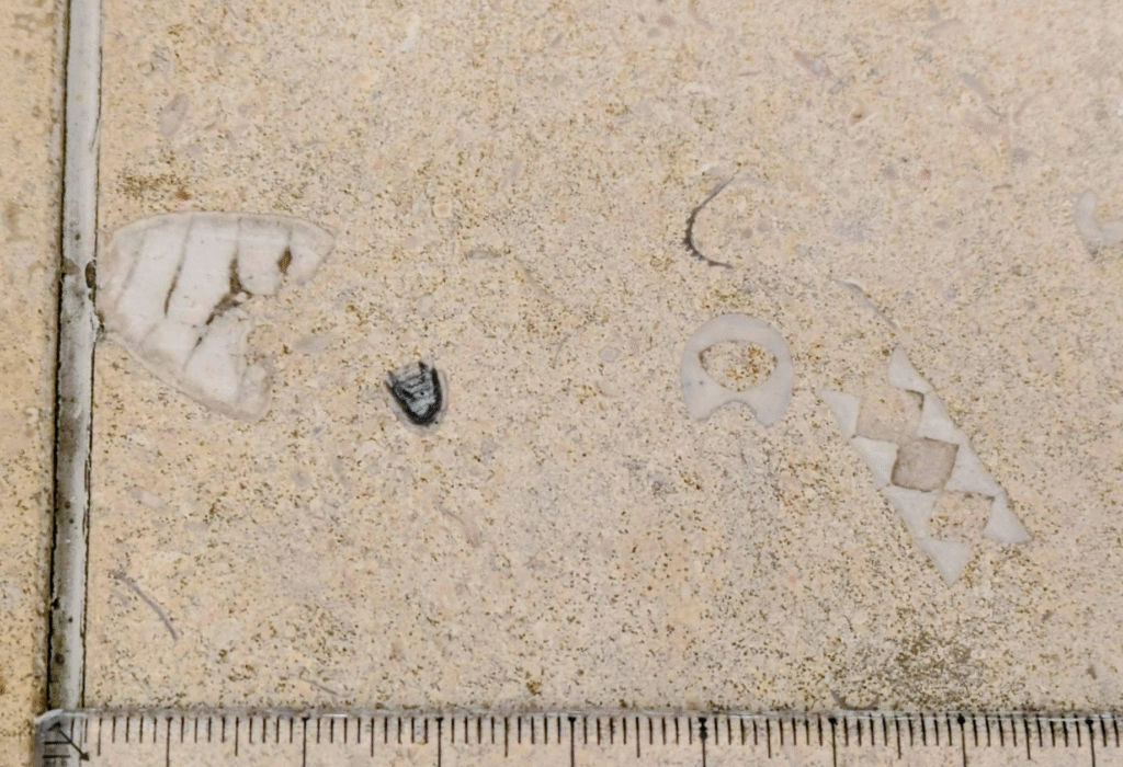 (1)では細かいウミユリ化石が多数見られます。(2)は大きな輪切り断面、(3)もウミユリ化石です。