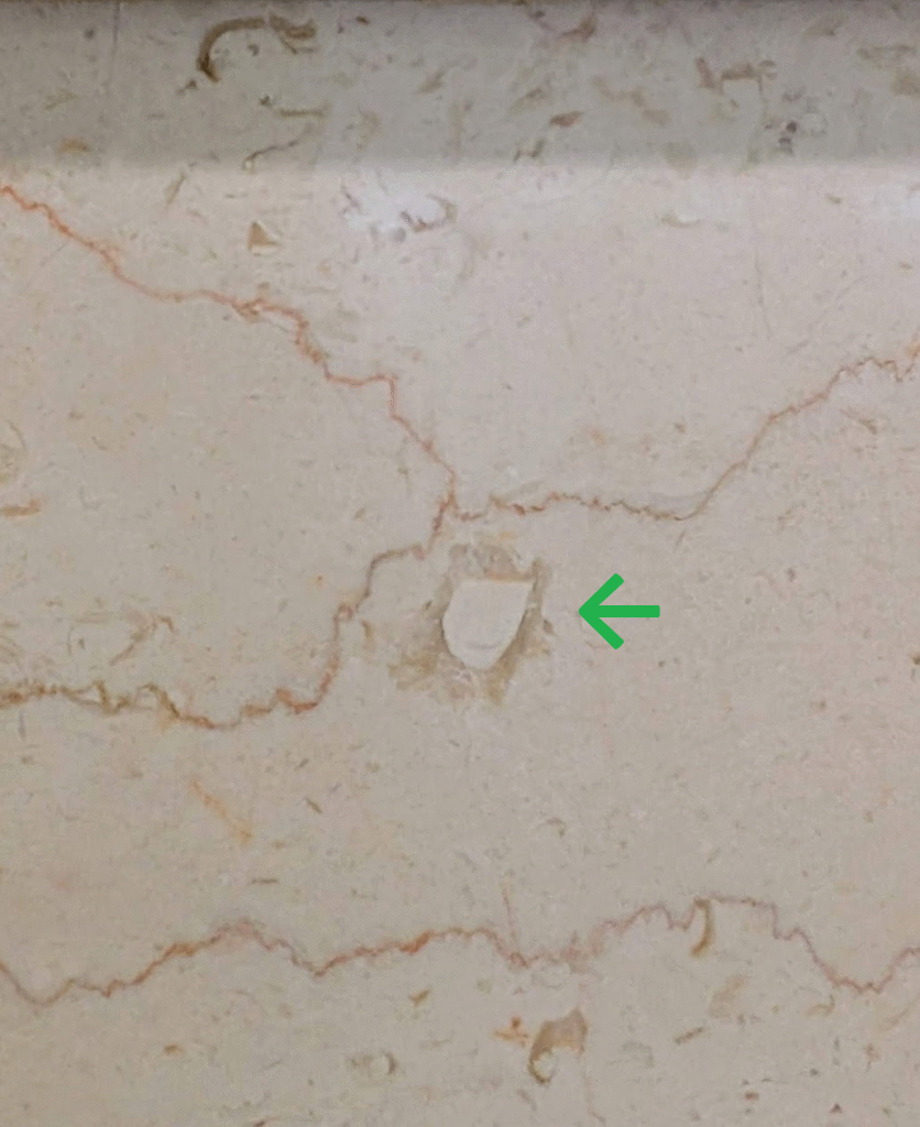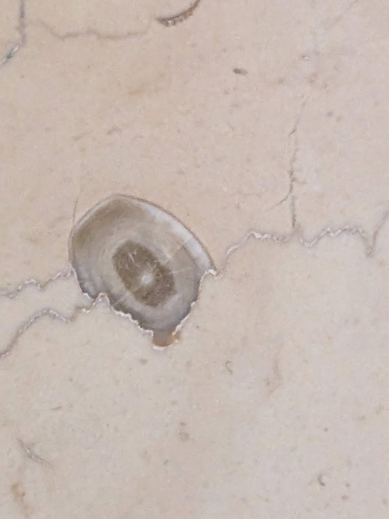 (8)もエントランス付近の様子です。←のイラン産大理石「シェルベージュ」の部分で、(9)の←の厚歯二枚貝化石を見つけました。