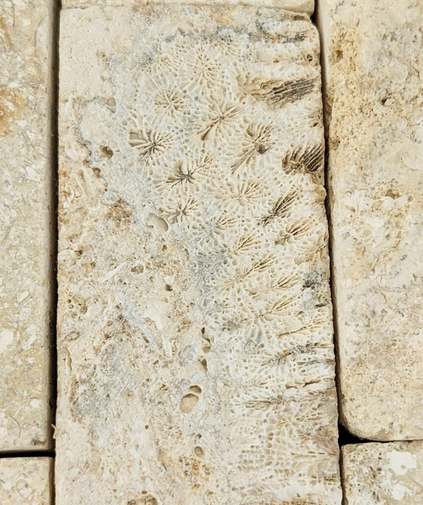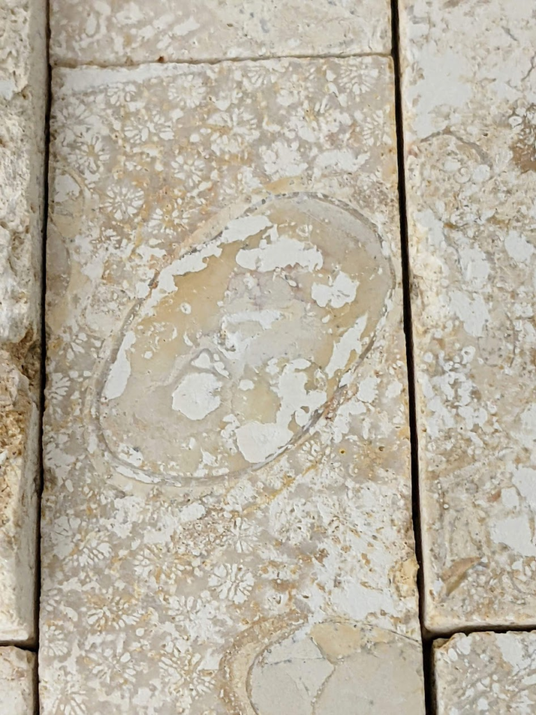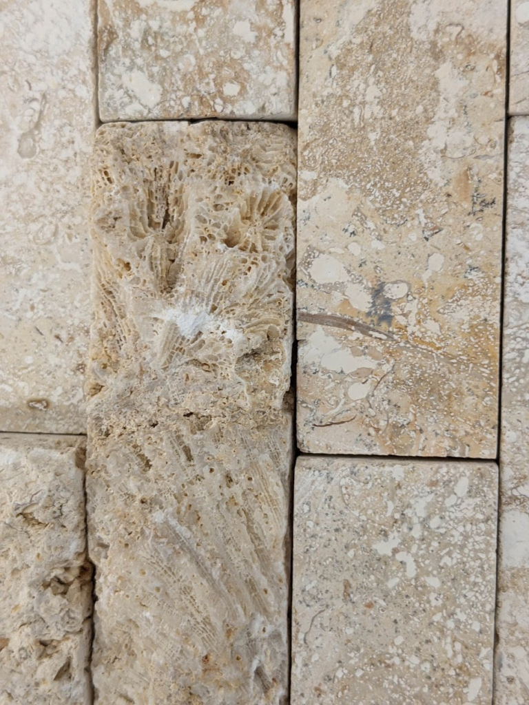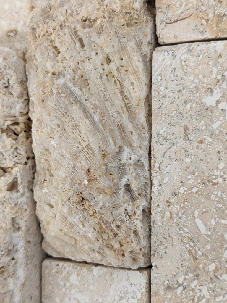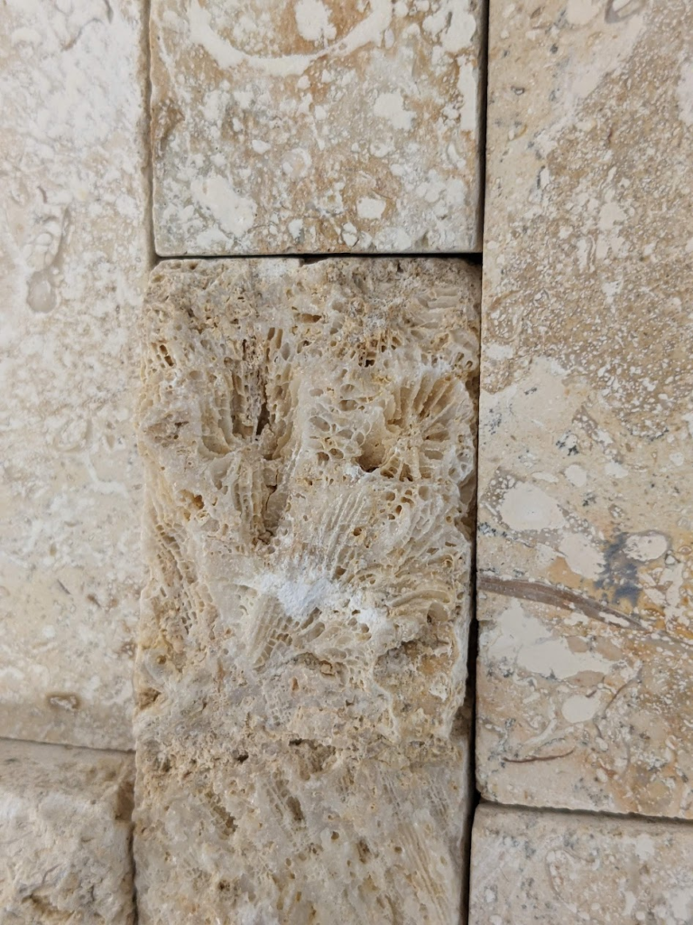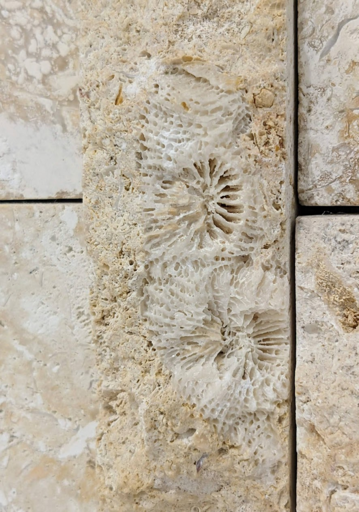 割肌仕上げではない部分にもサンゴ化石は多く見られます。