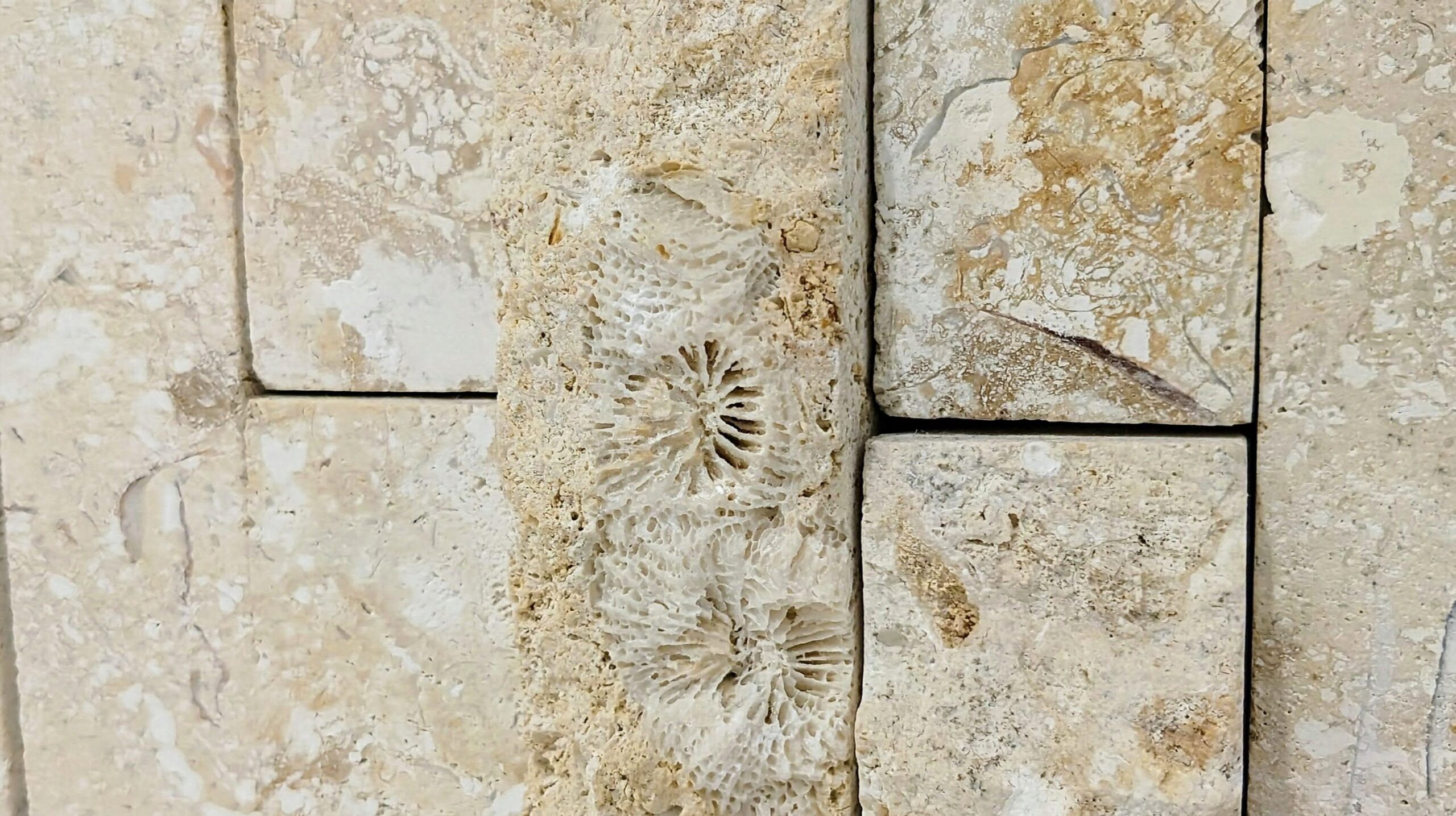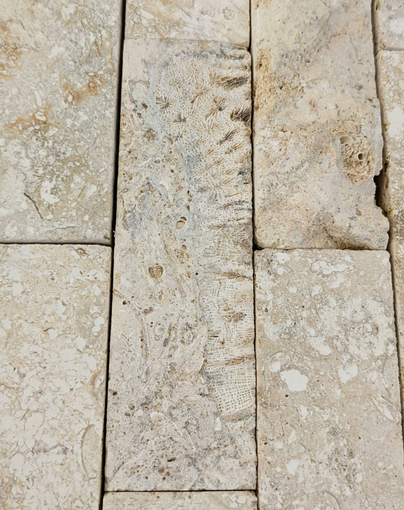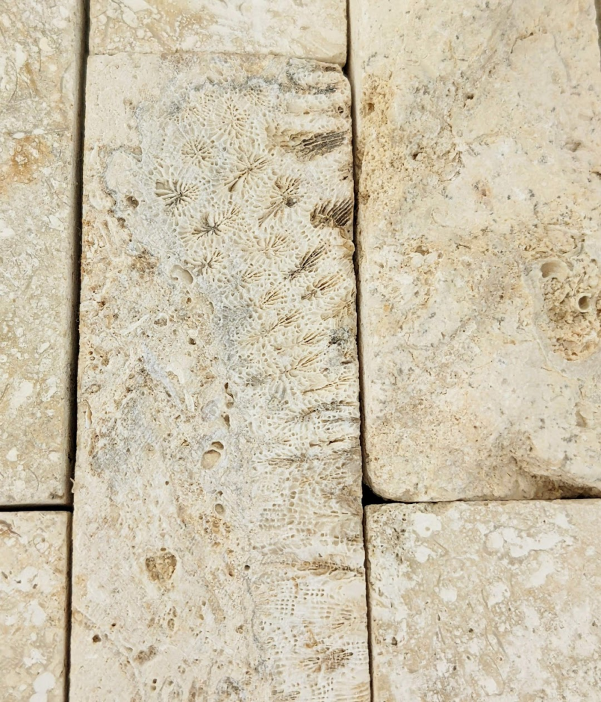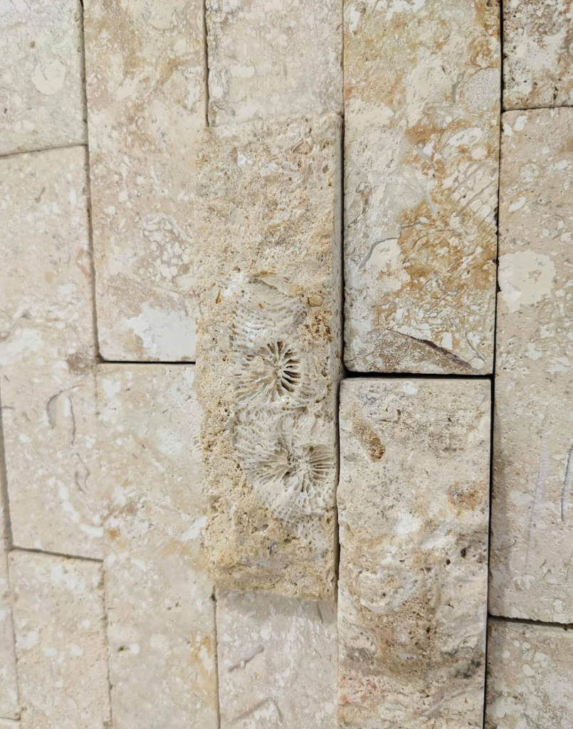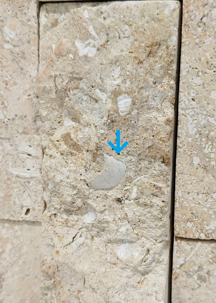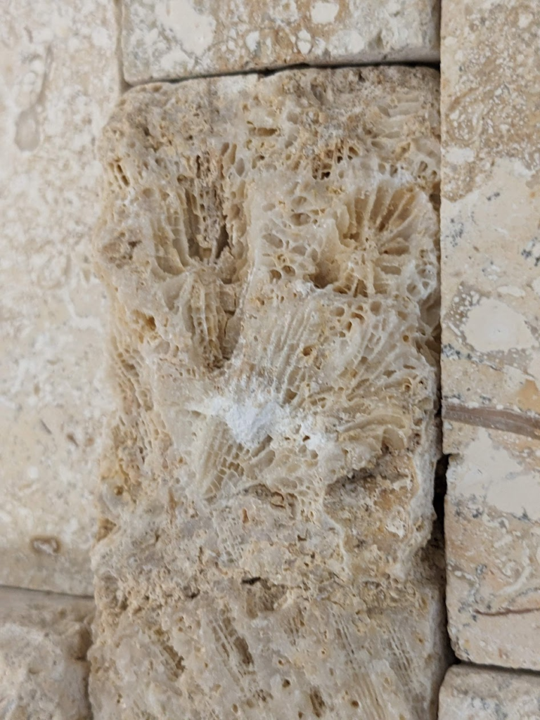 割肌仕上げではない部分にもサンゴ化石は多く見られます。