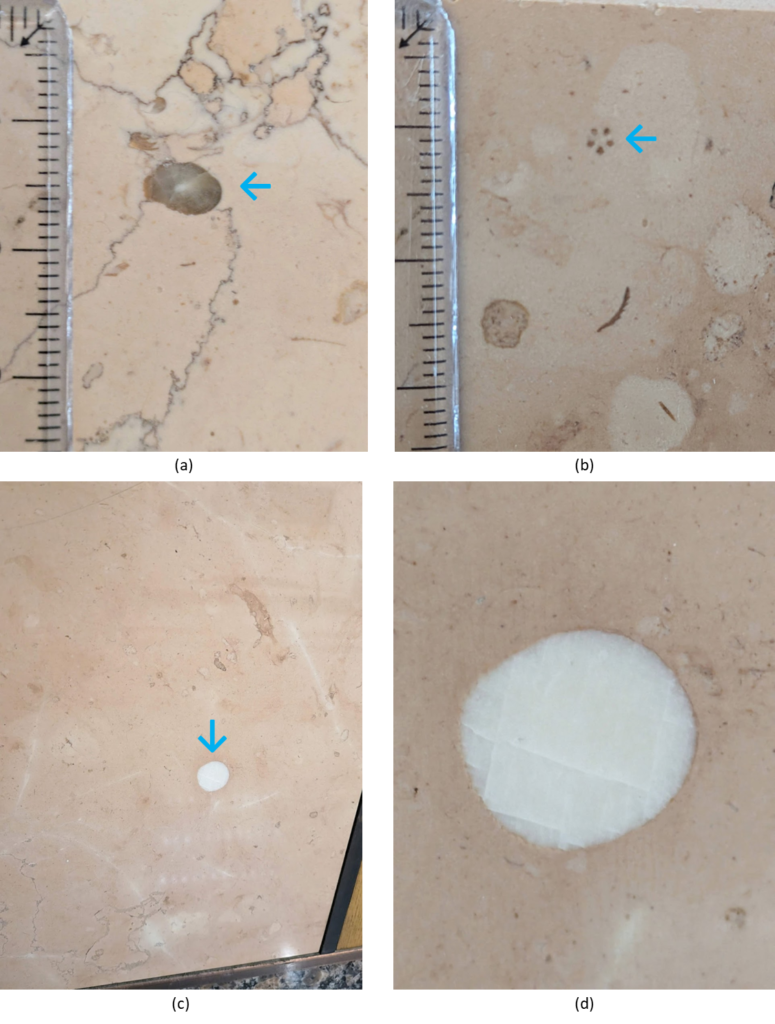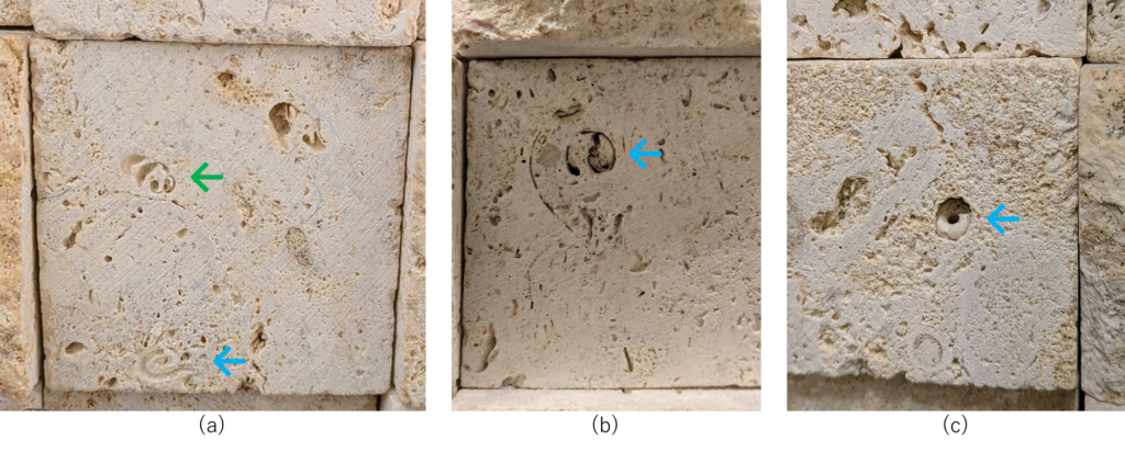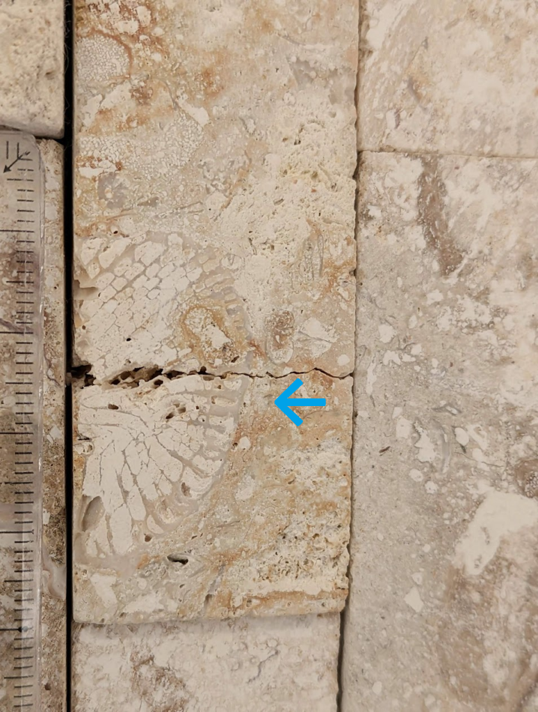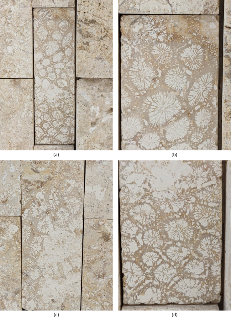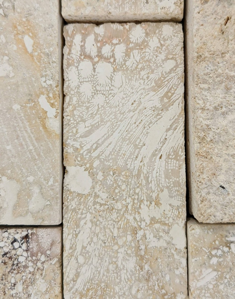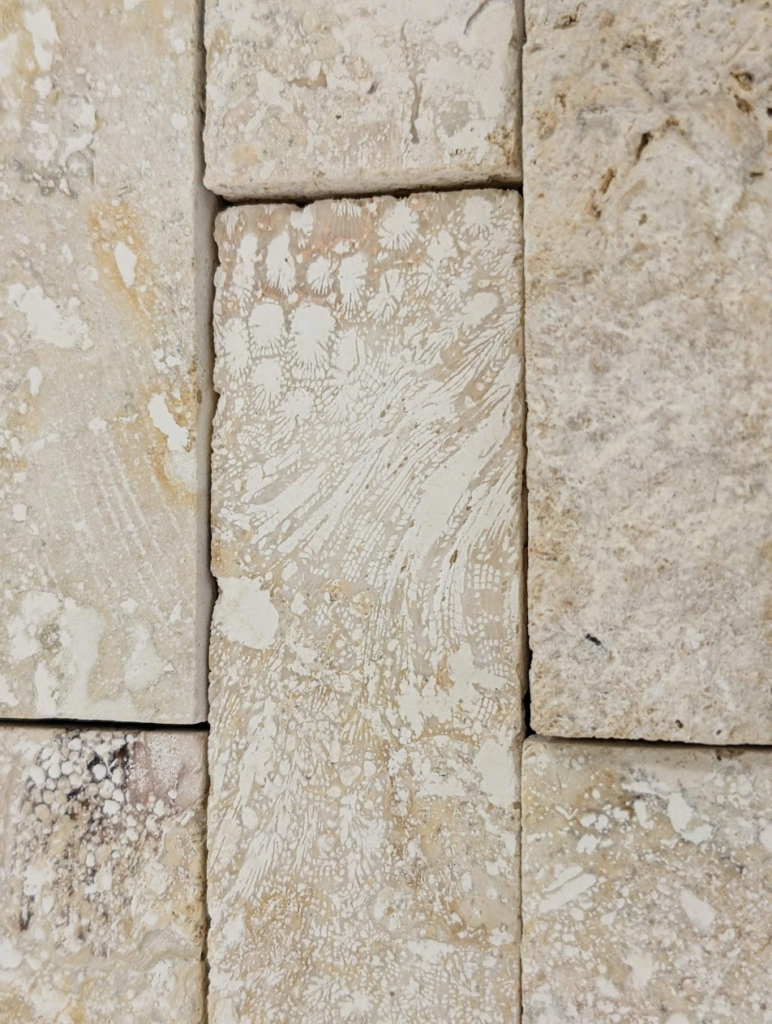 割肌仕上げではない部分にもサンゴ化石は多く見られます。