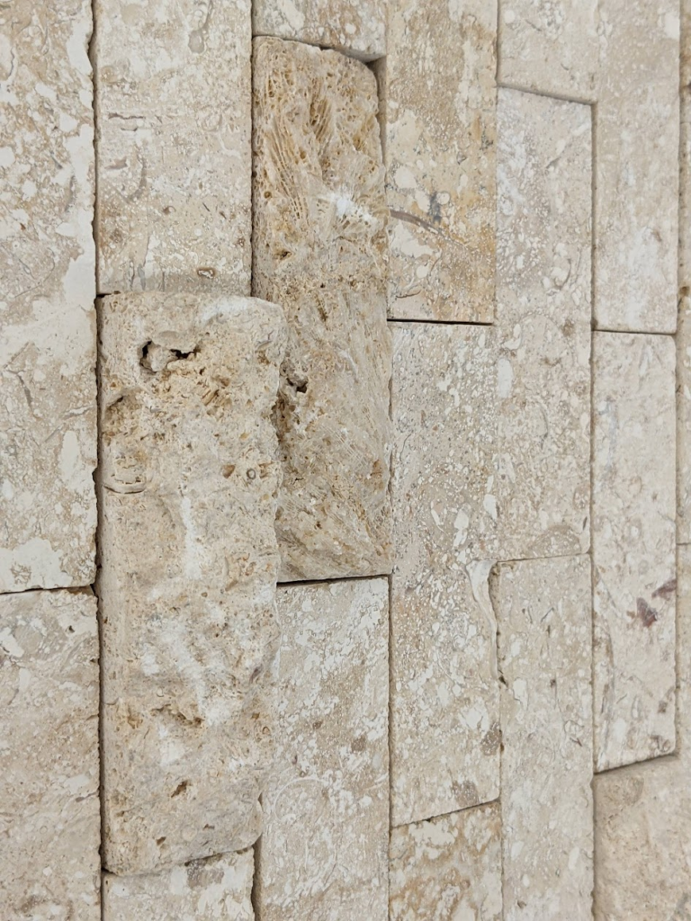 (1)のように割肌面と研磨された面のブロックが組み合わされたデザインでブロック一つの大きさは3×10cmです。