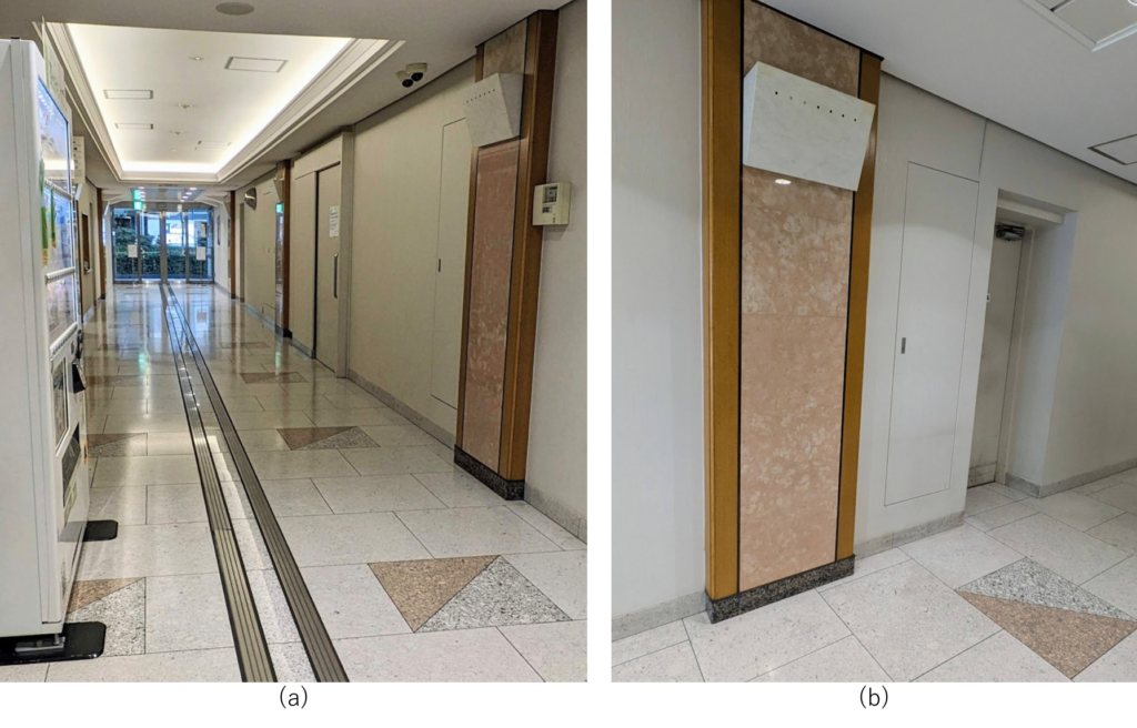 (d)は化粧室出入り口から丸の内線銀座駅改札方向を見た様子です。