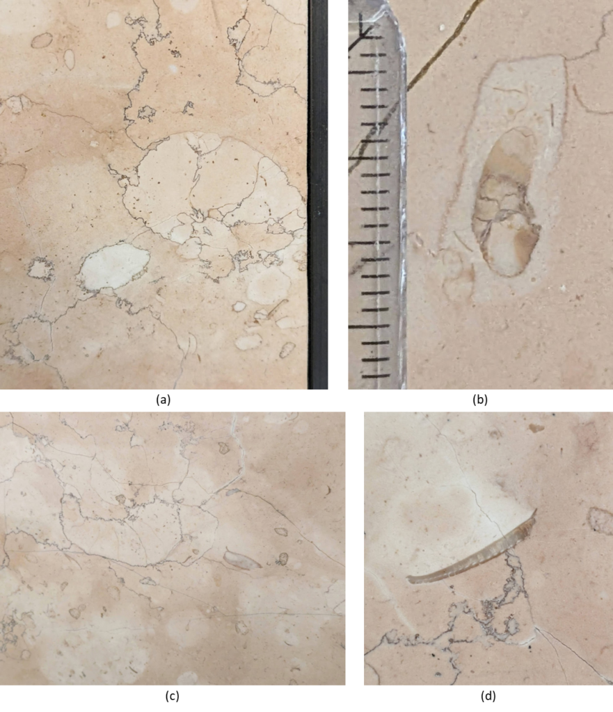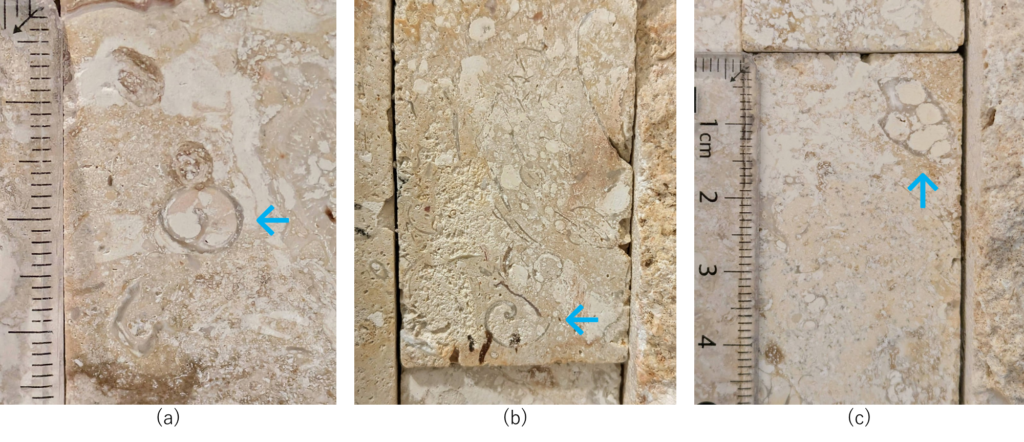 (2)のように割肌面では立体的にサンゴ化石が見られます。