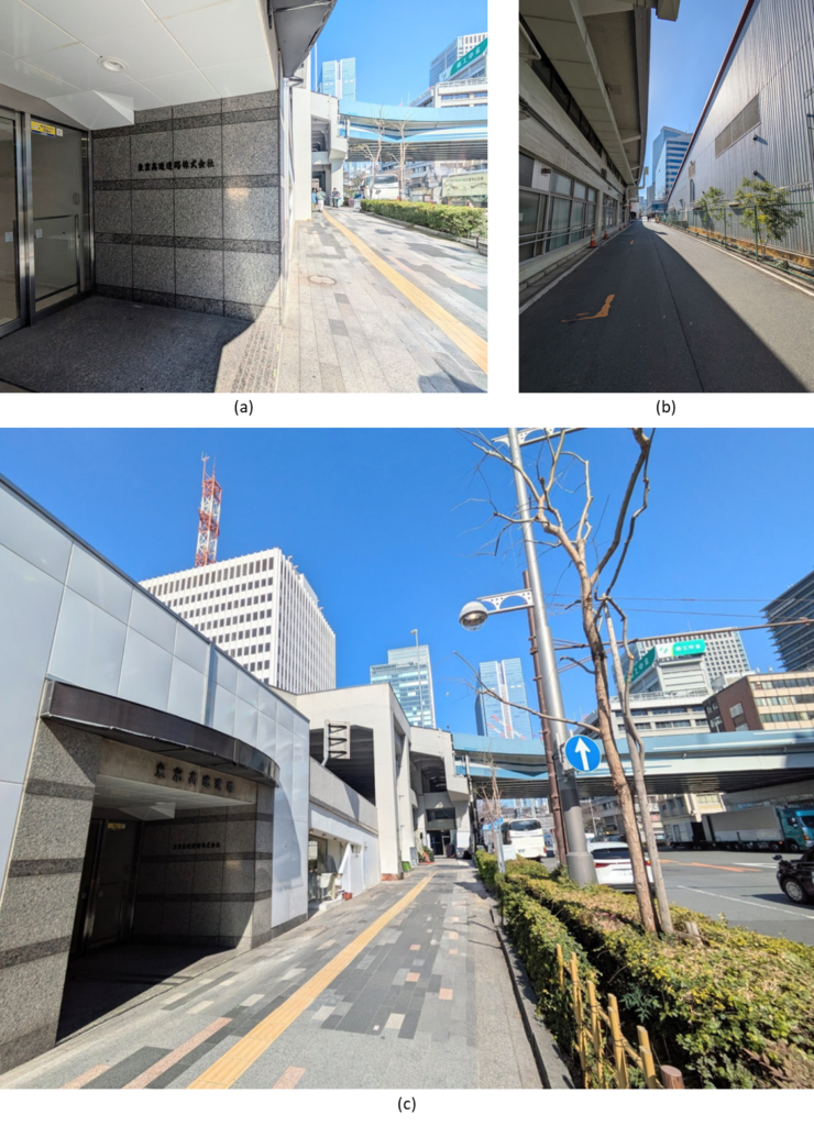 下の写真は地上道路の様子で(a)では八重洲方向を、(b)では別出入り口から新橋方向を見ています。