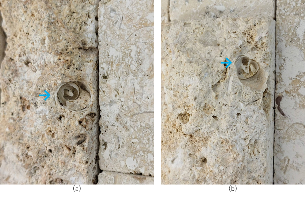 丸の内線銀座駅C8出口近くの化粧室内壁面にはブロック状の琉球石灰岩が組み合わされて使われています。