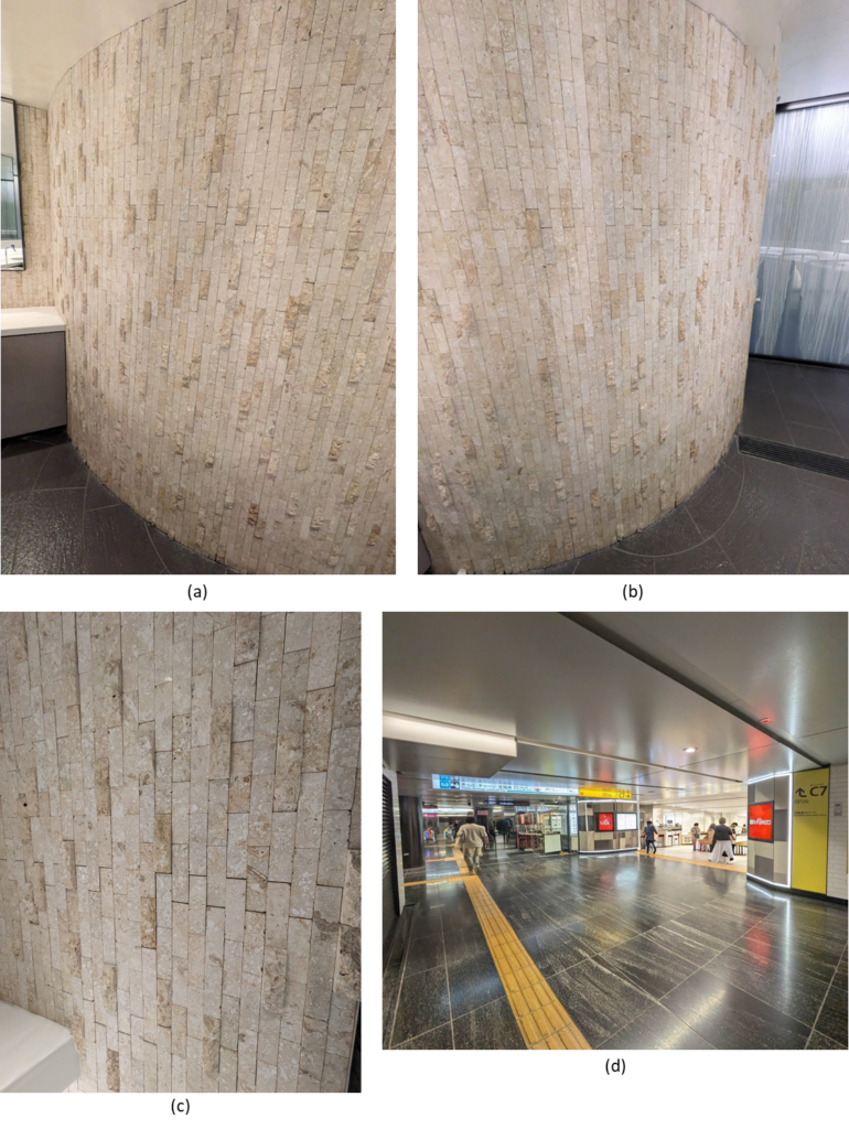 下の(a)~(c)は洗面台や鏡のあるコーナーの壁面の様子です。カーブを描いていて美しいです。