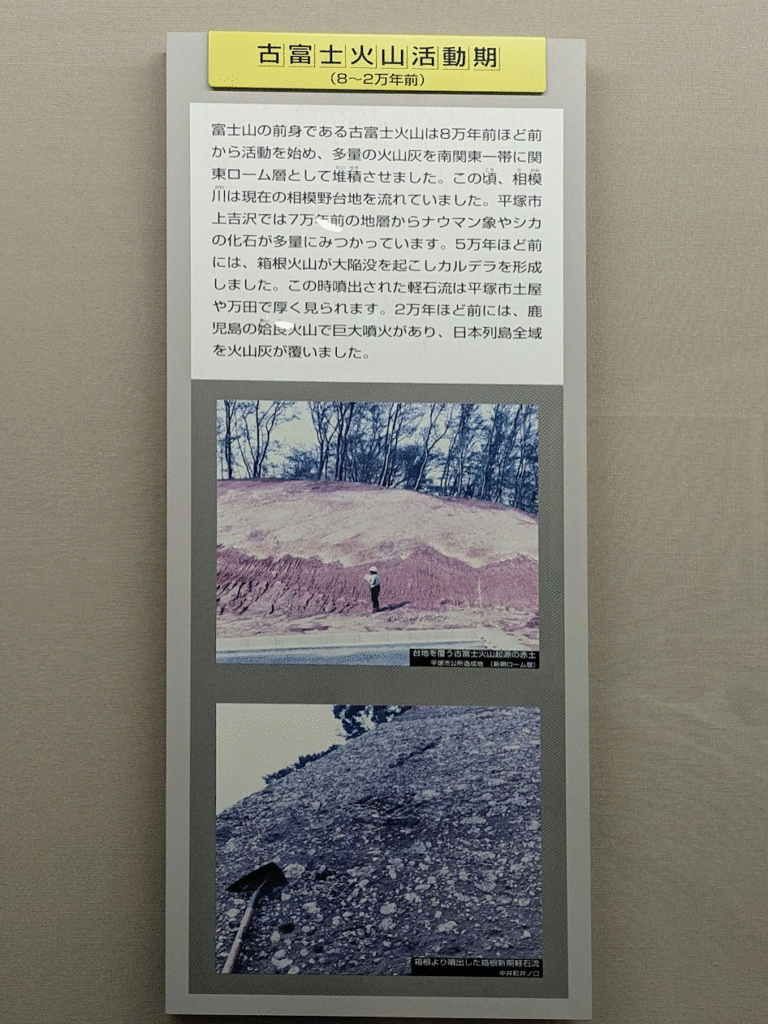 相模川流域の大地の歴史が岩石や化石と共に解説されています。(2)の解説部分が(3)です。