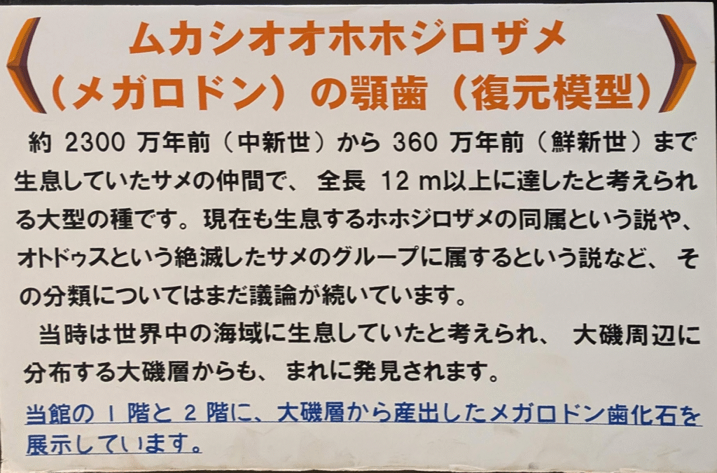 4.の(5)の説明にもメガロドンの歯化石展示の事が書かれていますが、1つは2.の(12)にあり、もう1つは1階「博物館へようこそ」コーナーにあります。