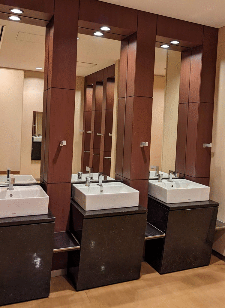 以前𝕏にもポスト(こちらとこちら)しましたがフロアによって女性用化粧室の洗面台にベルギー産大理石プティグラニが使われていて細かな化石が見られます。