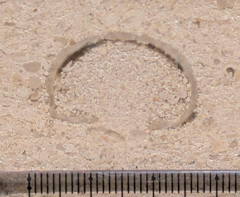 サンゴや腕足類の周りにも沢山見られるウミユリ化石です…断面の色々な形が楽しい化石です😊