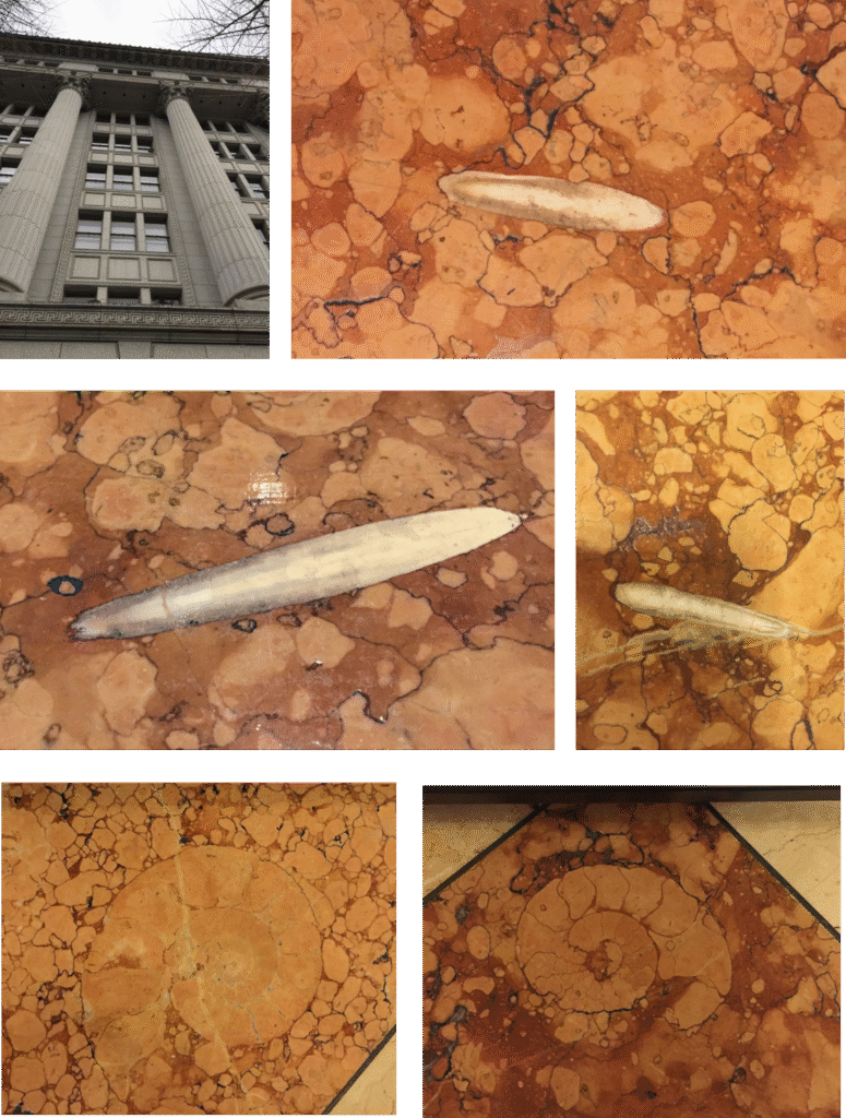1階の「ティファニー丸の内店」の外壁の一部分に、ベルギー産 プティグラニ(プチグラニ )と思われる大理石が使われていて化石も見られます。