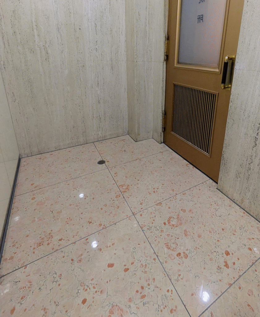(10)の個室以外の床面の石材は詳細がわかりませんが「日本橋三越本店」中央階段の最下段(地下1階)の物と似ているかなと思いました。