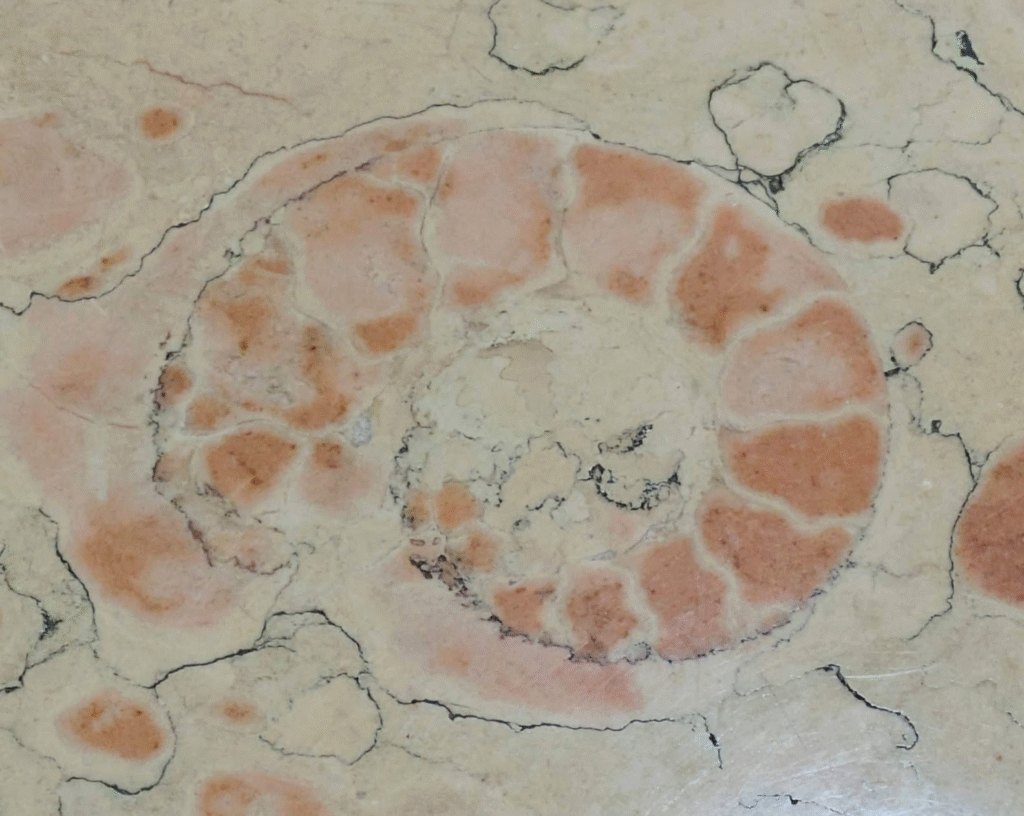(c)は一番右側の壁間際の様子です。大理石ネンブロロザートの→に(d)のアンモナイトが。