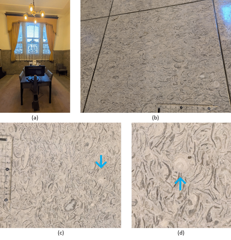 個室内の床面の石材はネンブロロザート(d)でアンモナイト(e)~(g)やべレムナイト(h)がありました。