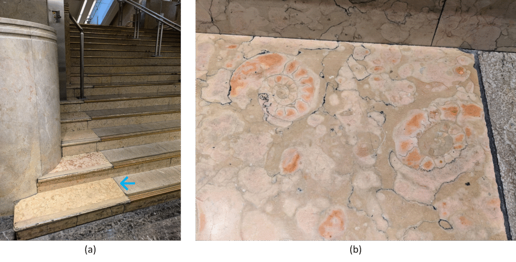 下は「三越本店」で撮った物です。(a)の←が(b)です。この段の床面だけ化石の色が他の段と違うんです🧐…