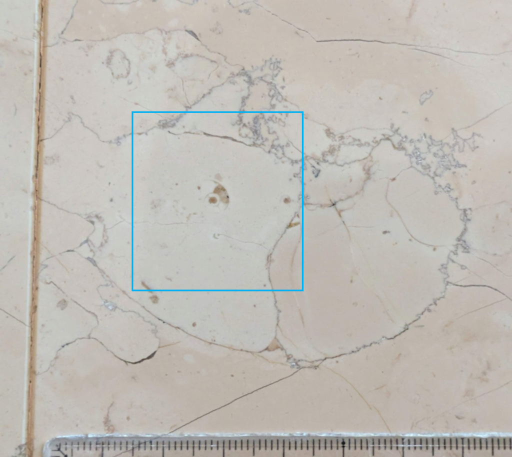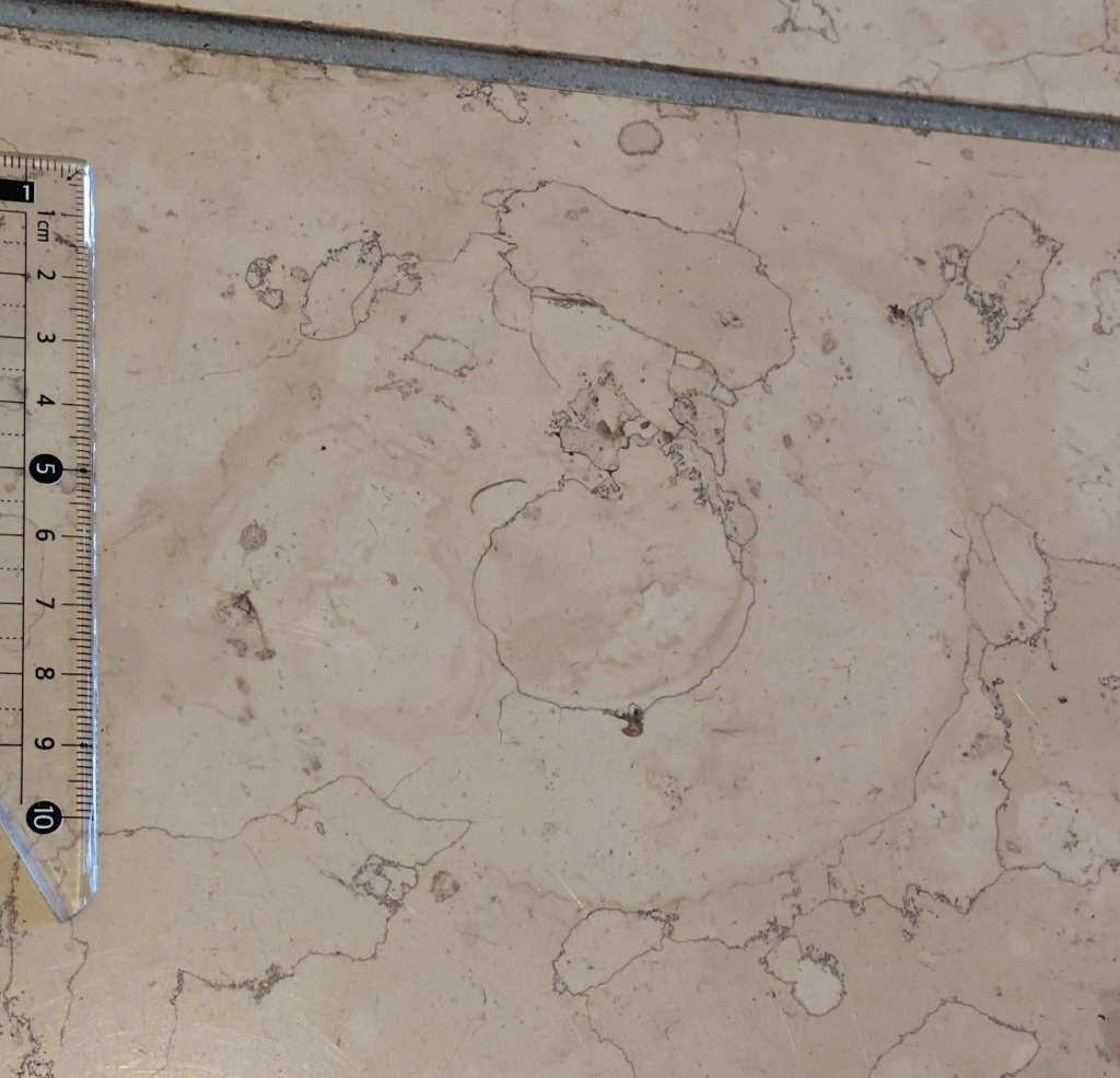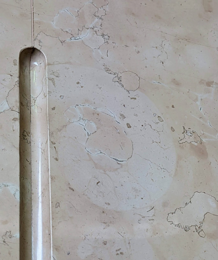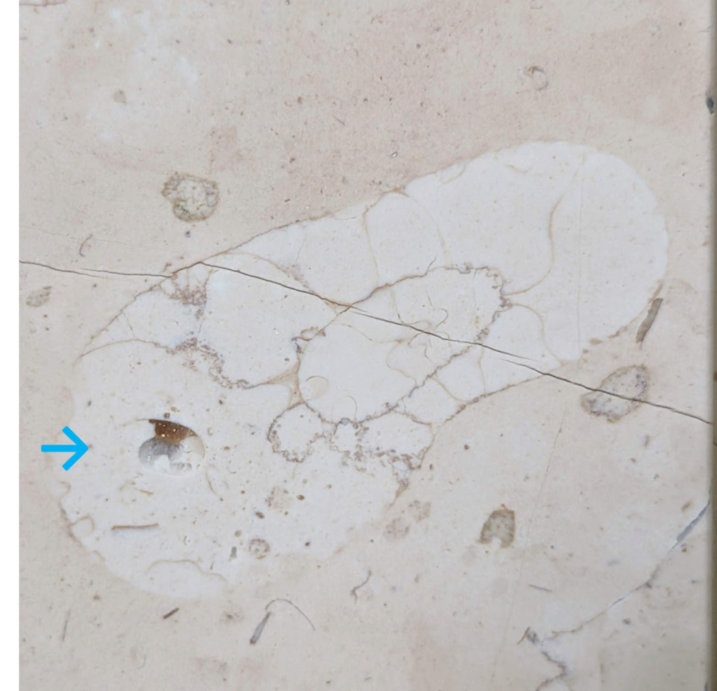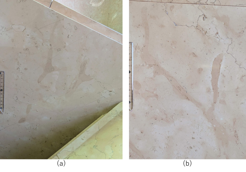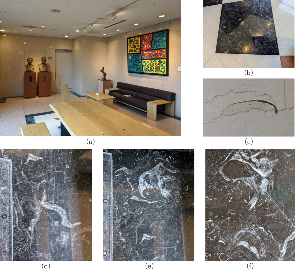 休憩室ではイタリア産ペルリーノロザート石材の他に、ペルリーノキャーロ、ロッソマニャボスキ、スペイン産ネロマルキーナ等も使われています(a)、(b)ペルリーノキャーロでは腕足動物化石を発見(c)