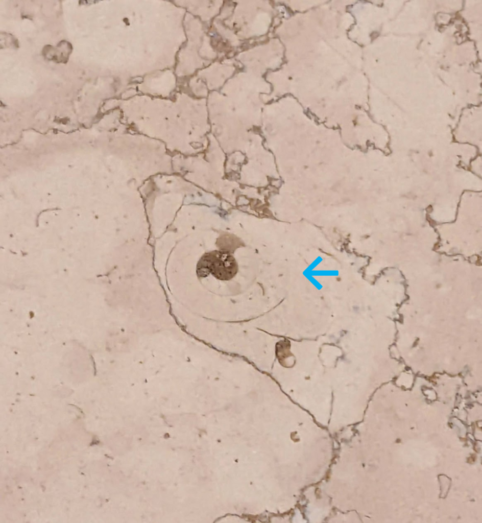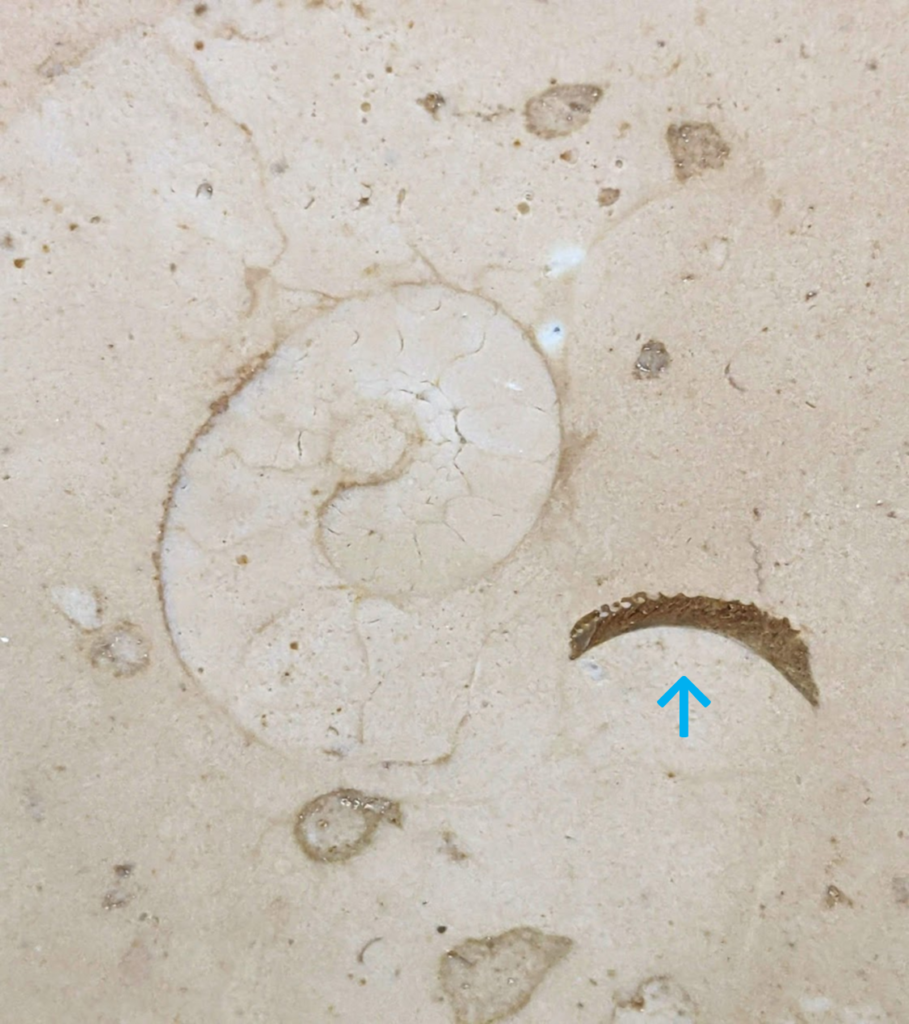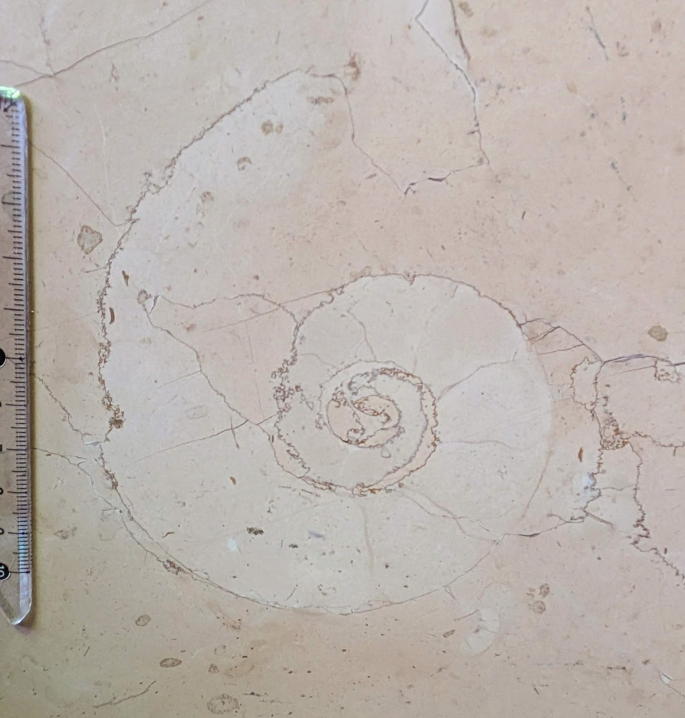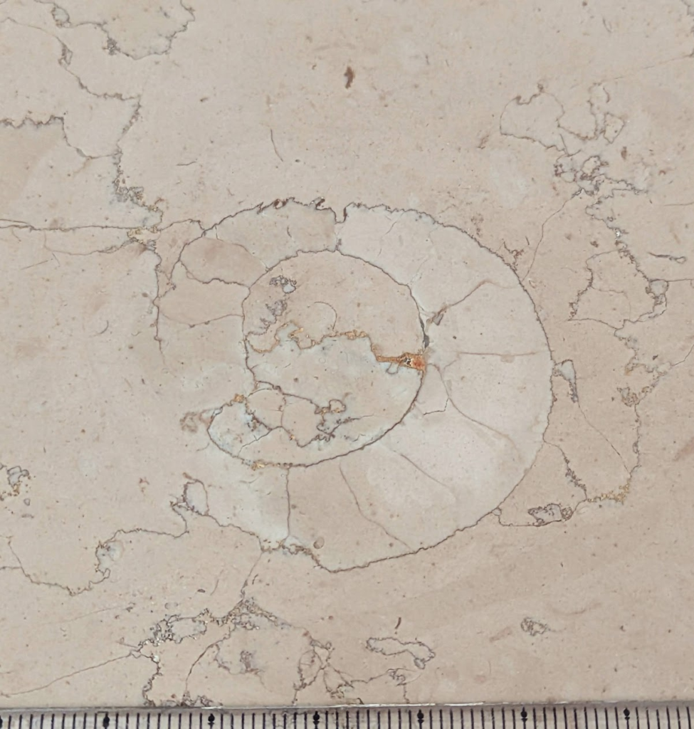 上のような場所のペルリーノロザート石材中のアンモナイト化石です。