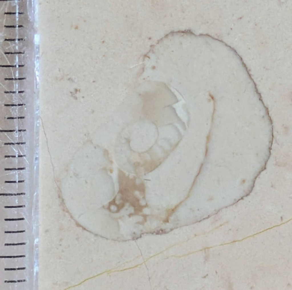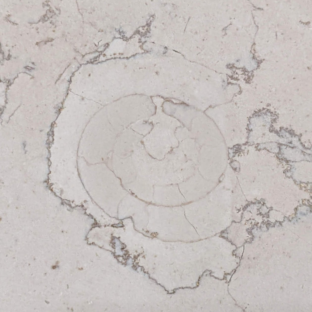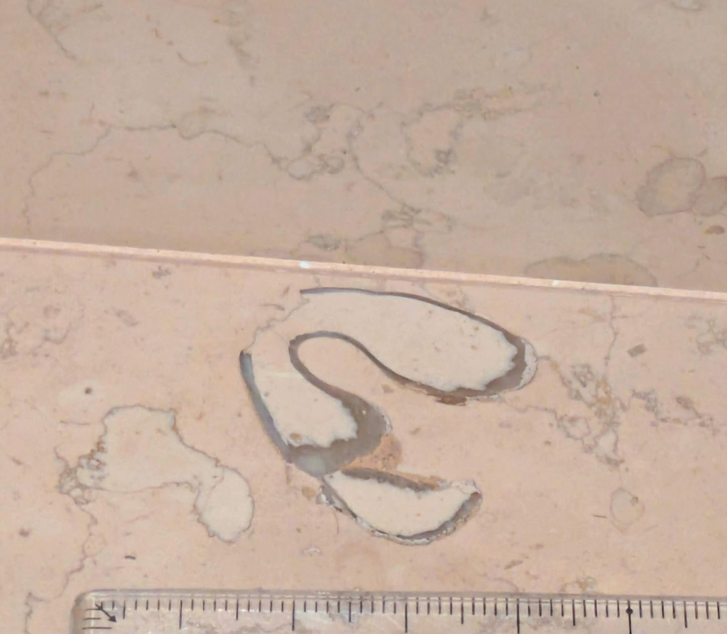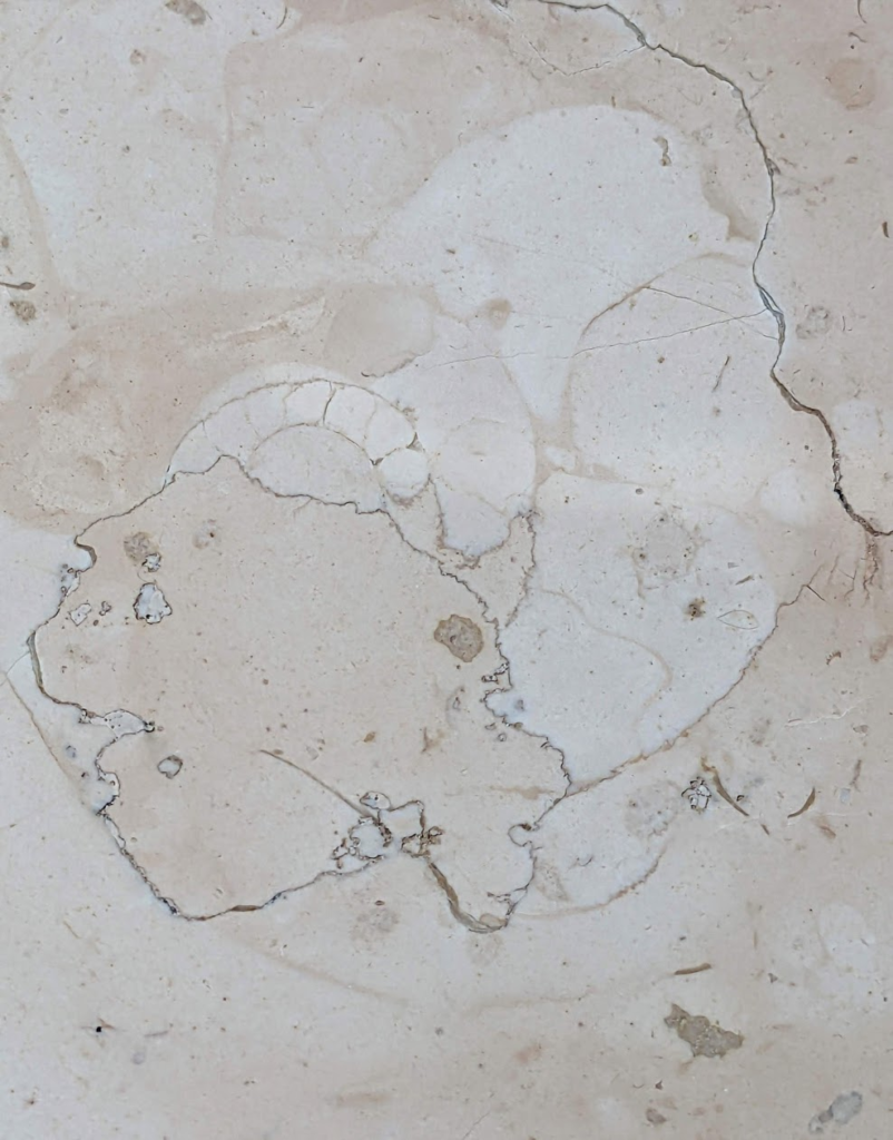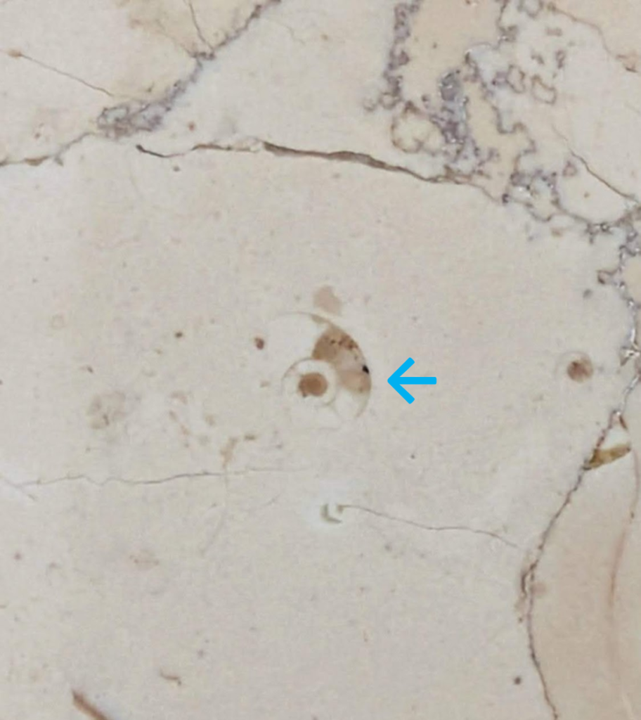 上のような場所のペルリーノロザート石材中のアンモナイト化石です。