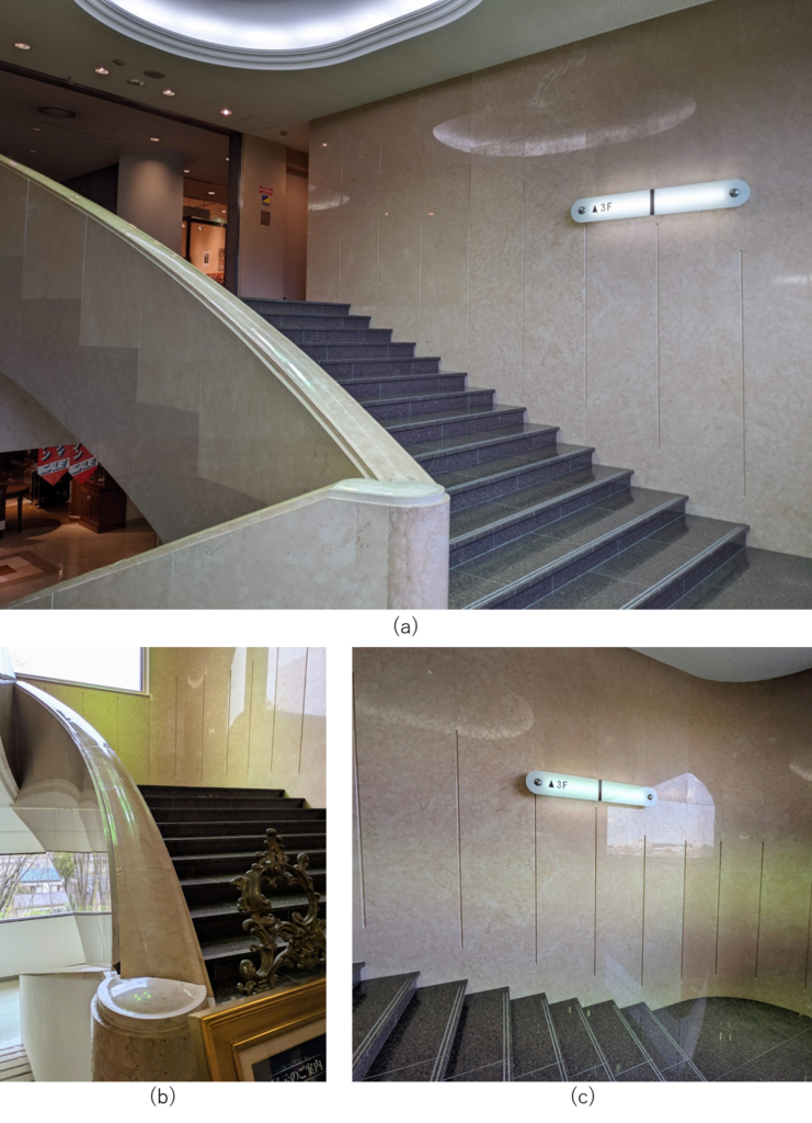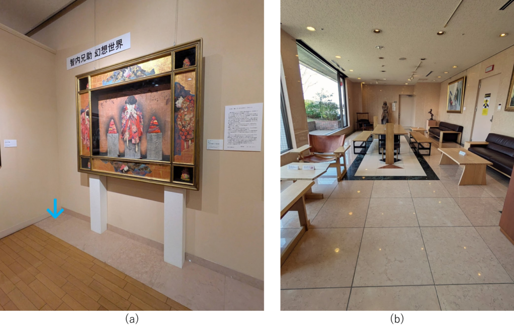 「村内ファニチャーアクセス」の八王子本店3階に美術館はあり、店舗2階から上がる階段の壁面にはイタリア産大理石ペルリーノロザートが使われています(a)。