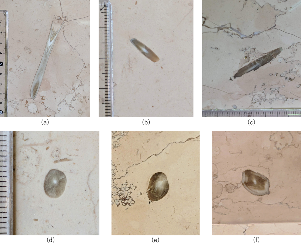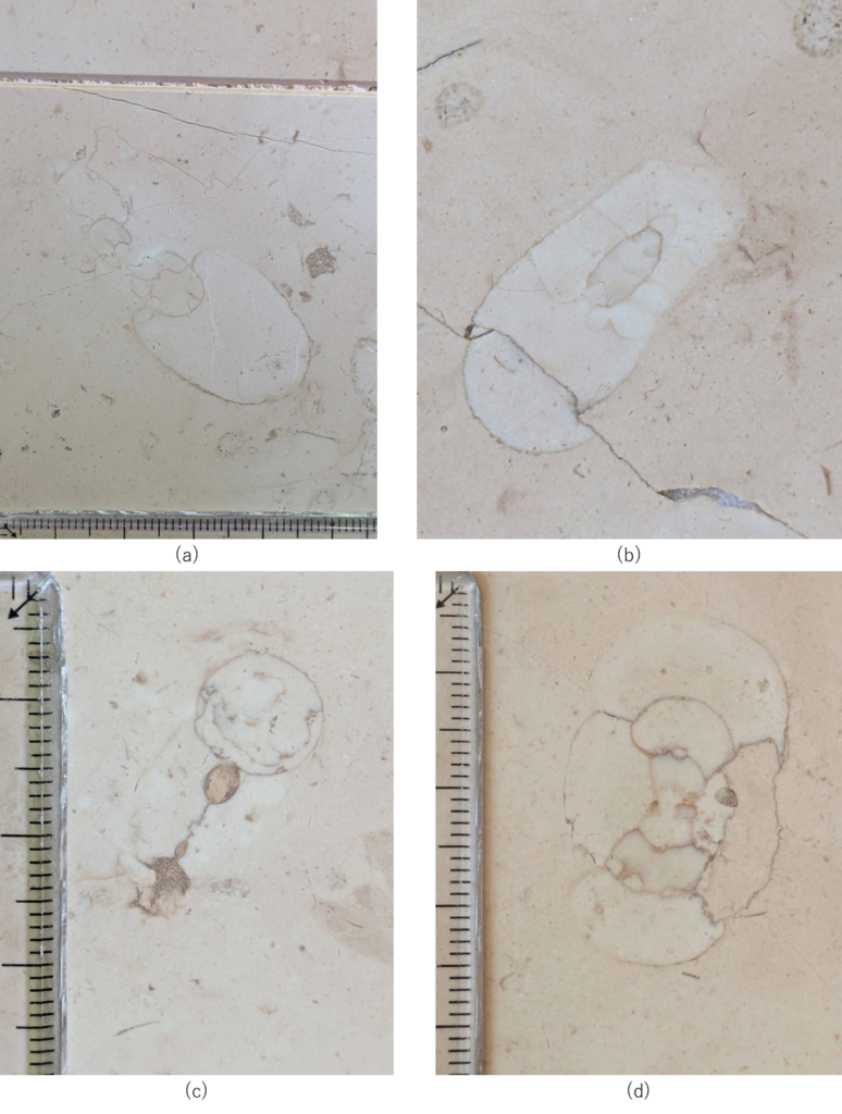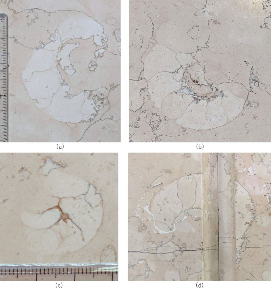 ネロマルキーナ石材中には厚歯二枚貝化石が多数見られます(d)~(f)