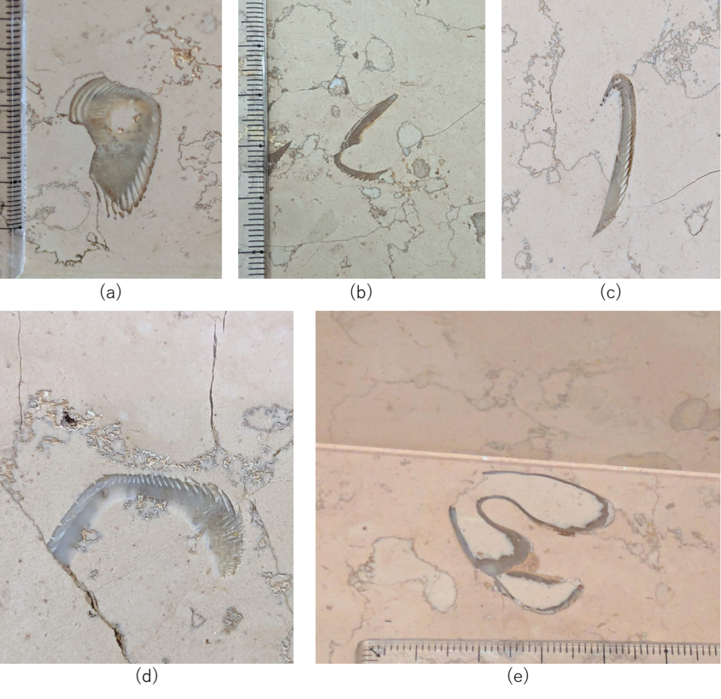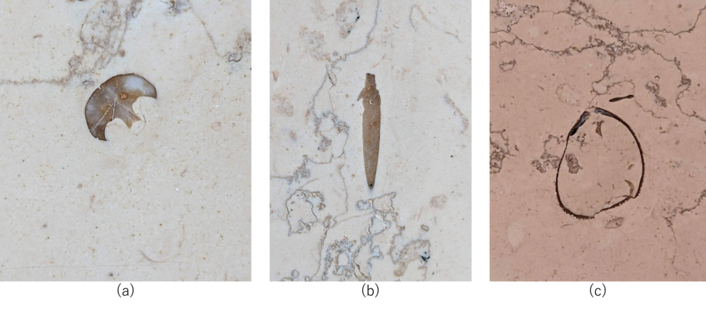 (a)はウニの口器、(b)はウニのトゲ、(c)は腕足動物でしょうか🤔