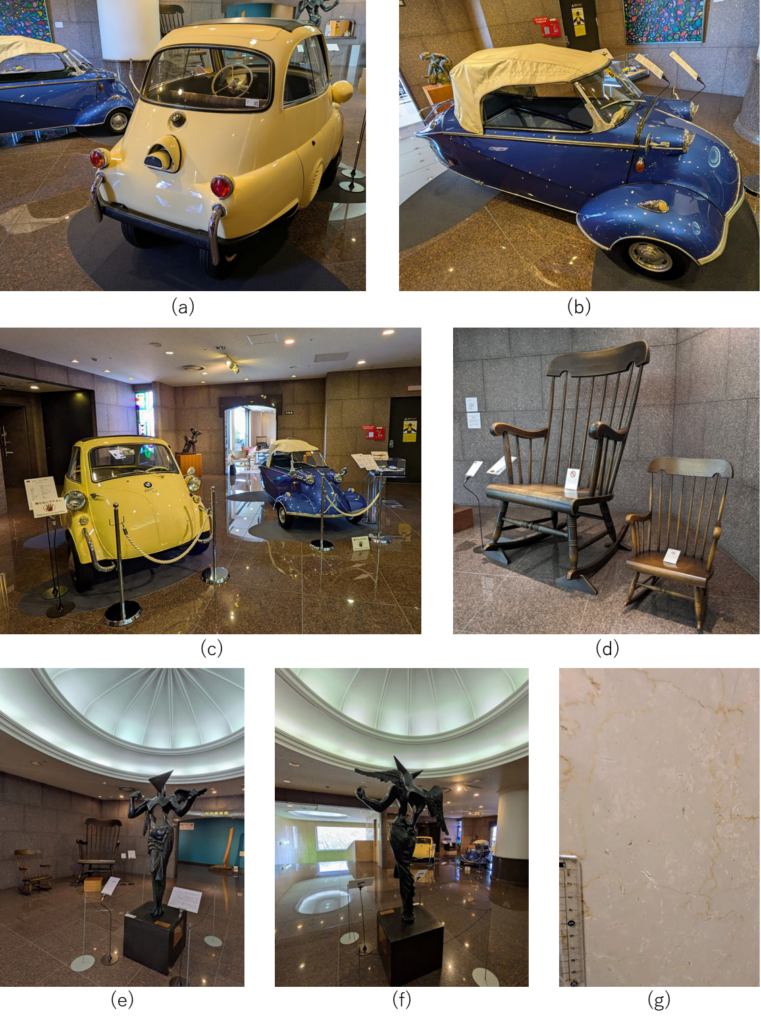 展示室前ロビーにも、クラシックカー(a)~(c)や日本一大きく世界でも稀少なジャイアントロッキングチェア(d)、ダリの彫刻(e),(f)…何度訪れても鑑賞能力のキャパオーバーとなってしまうくらいの豪華品が置かれています。