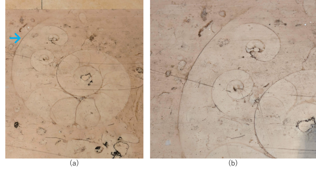 3階展示室内の床の一部にも↓のようにペルリーノロザート石材が使われていました(a)。