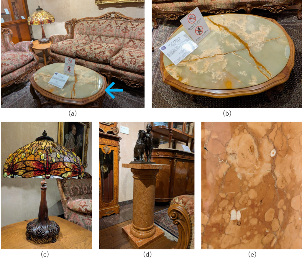 写真(a)の←のテーブルが(b)です。天板の石材はグリーンオニックス(グリーンオニキス)でしょうか。