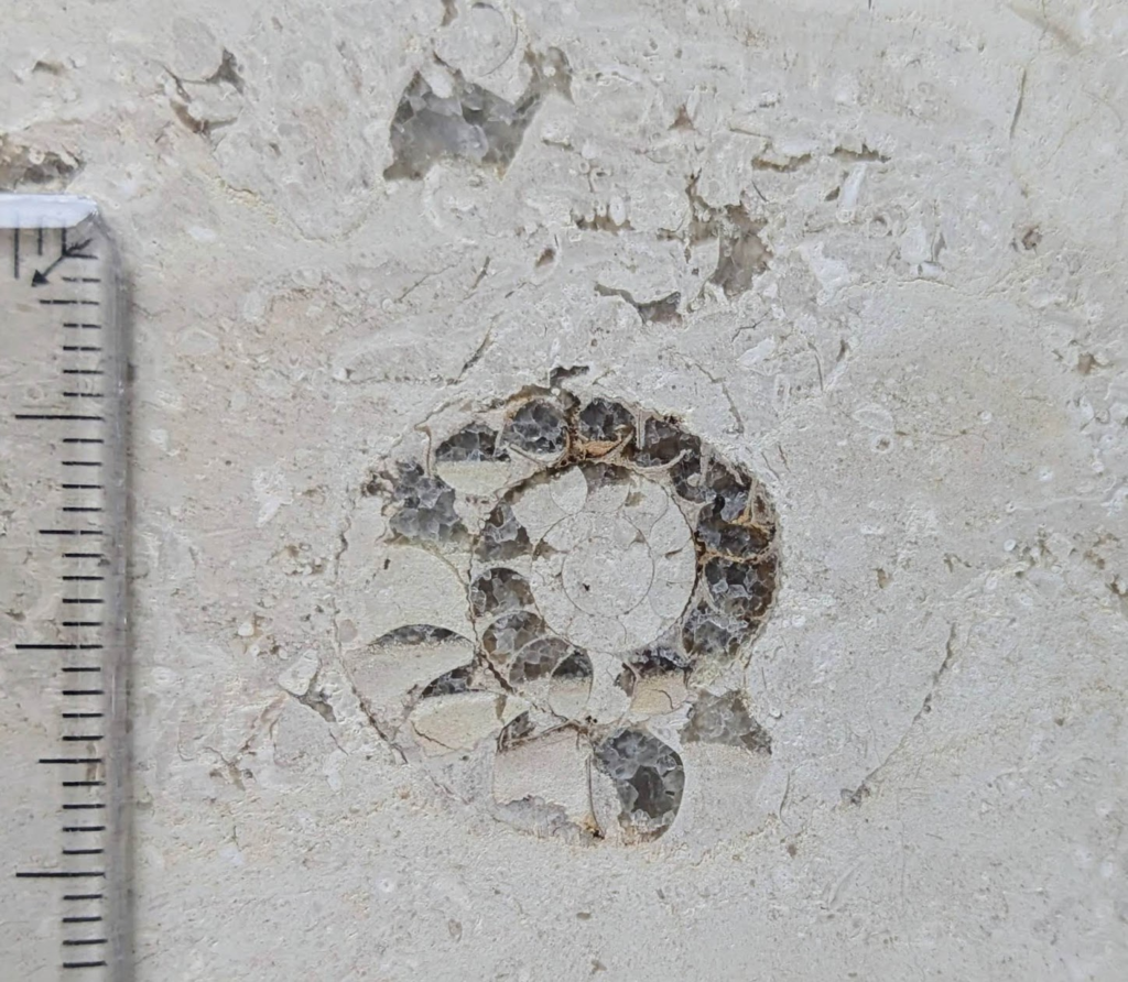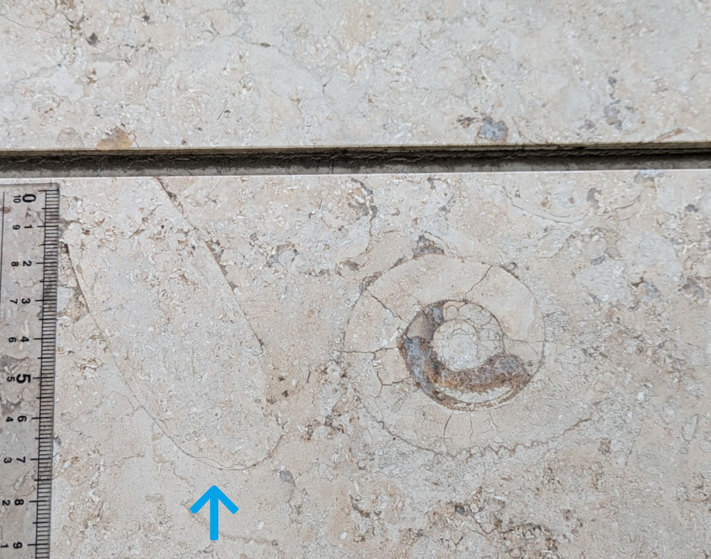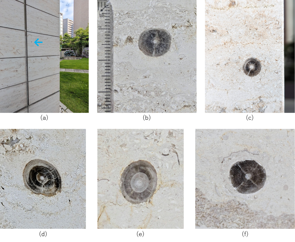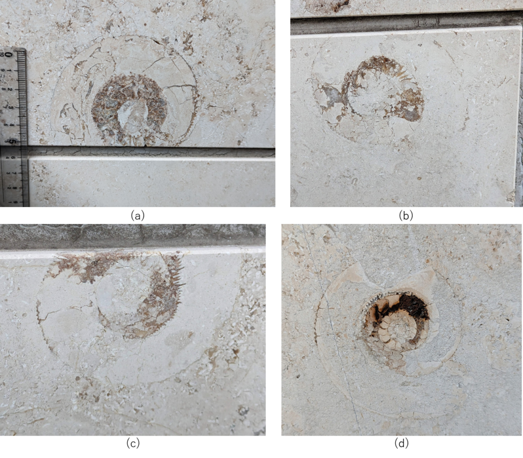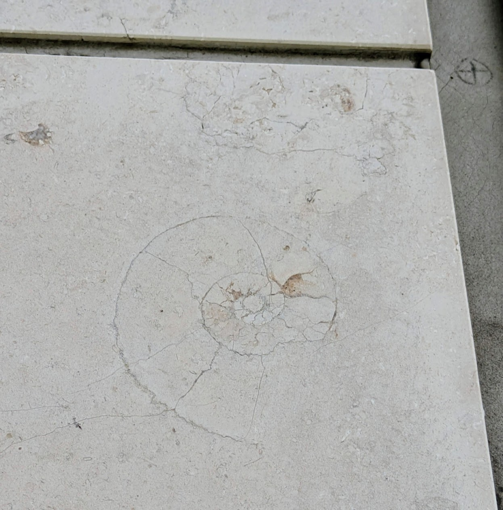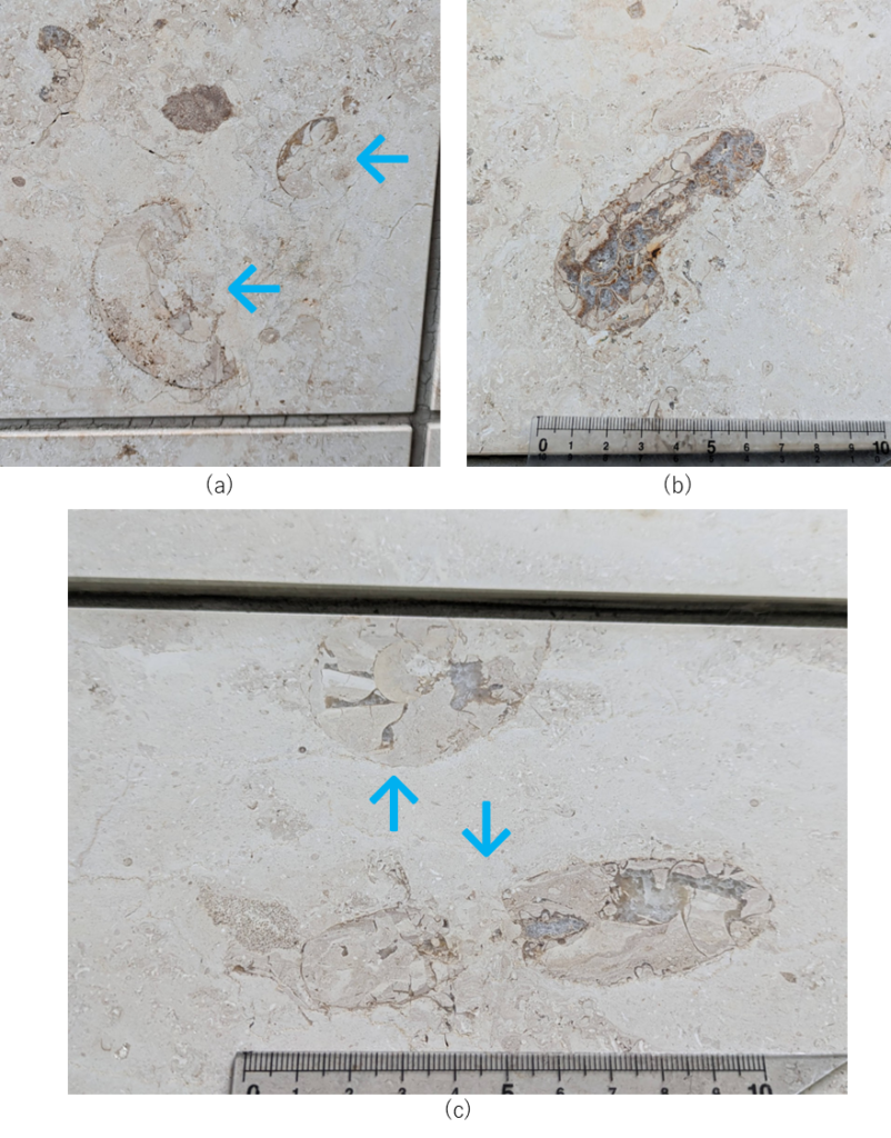 アンモナイトの縦切りの断面が、特に柾目の石材部分で多かったです。