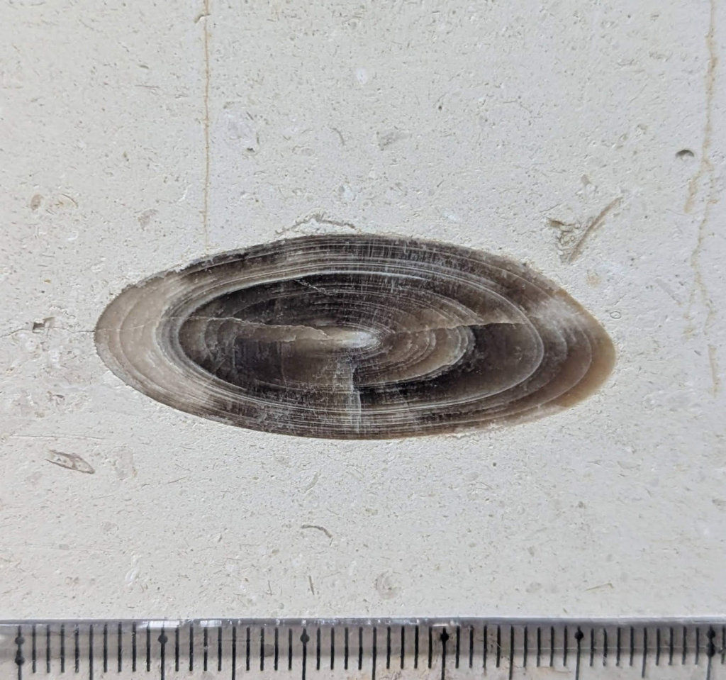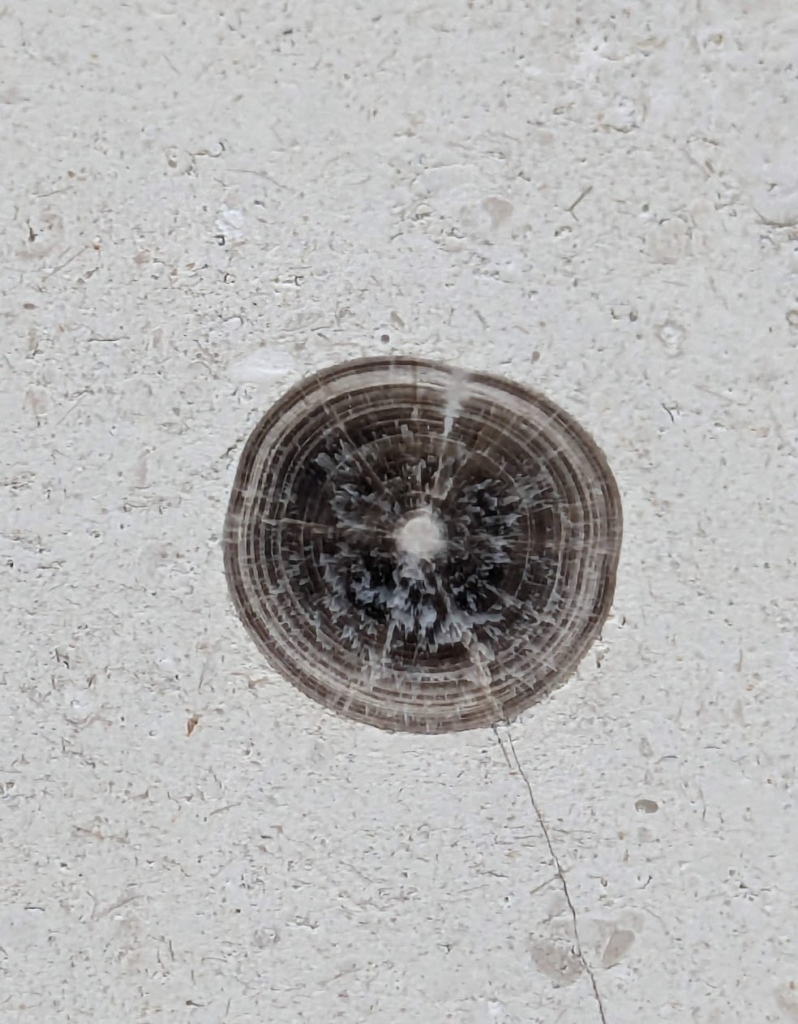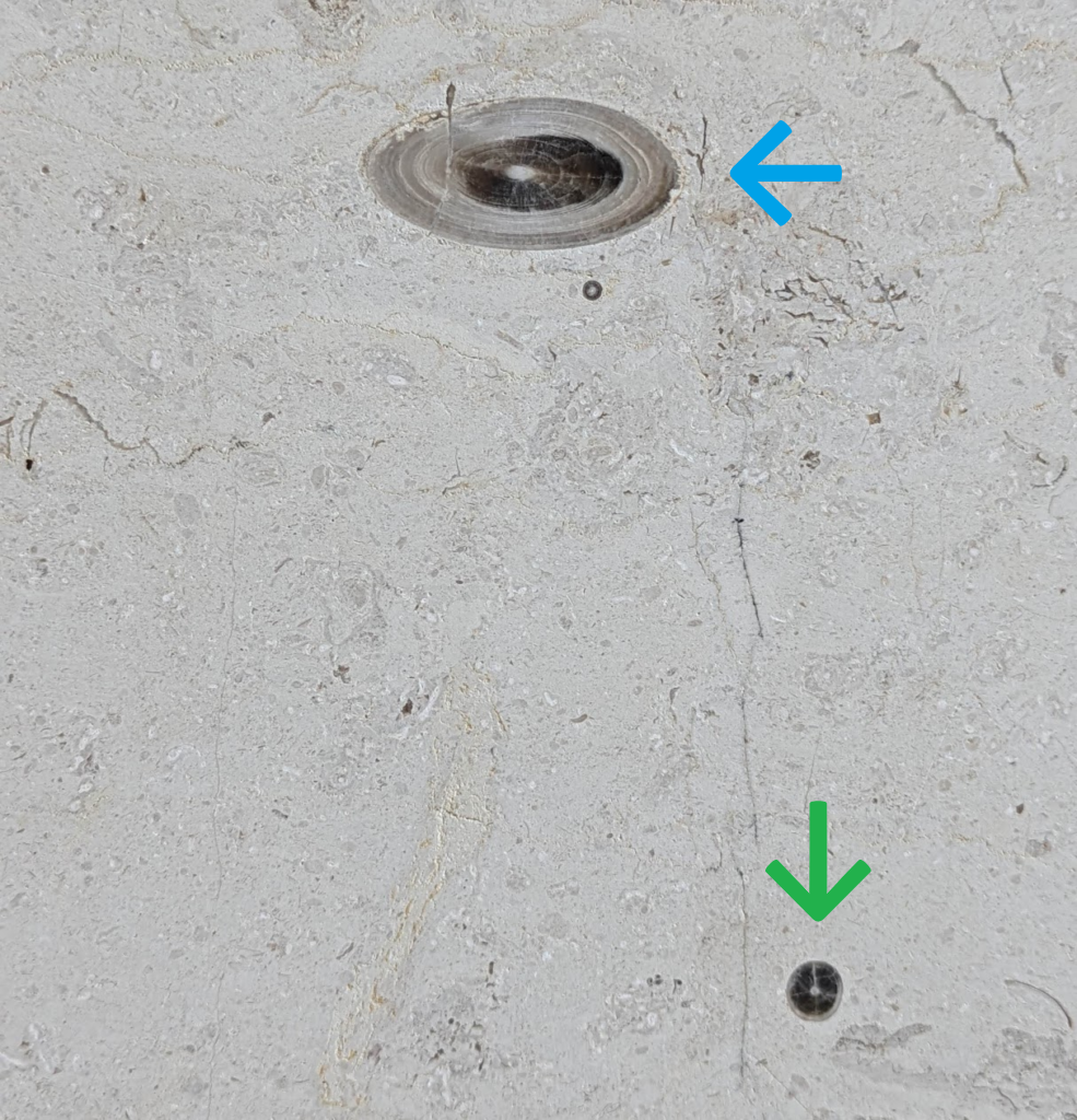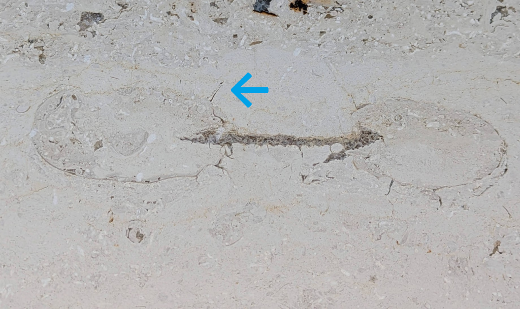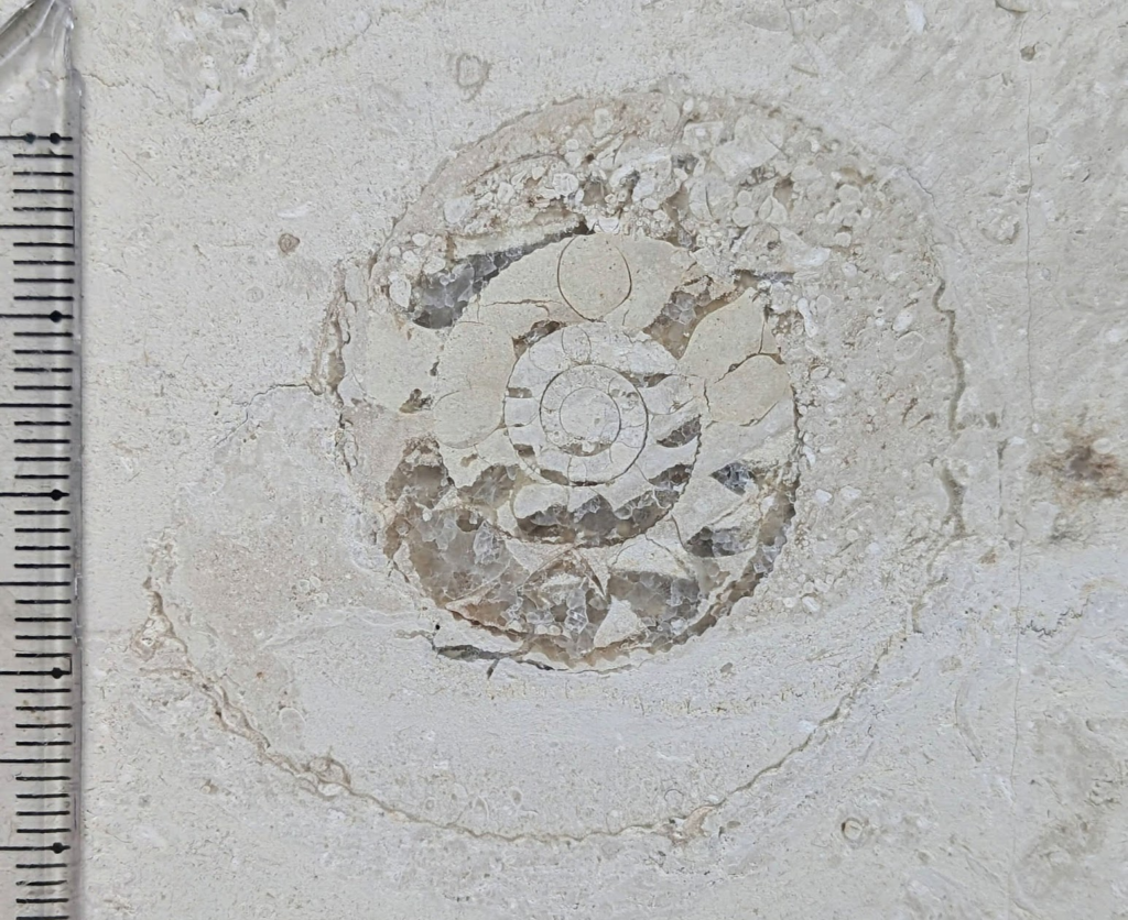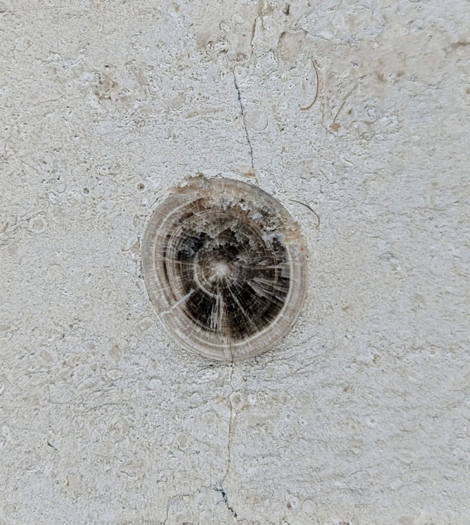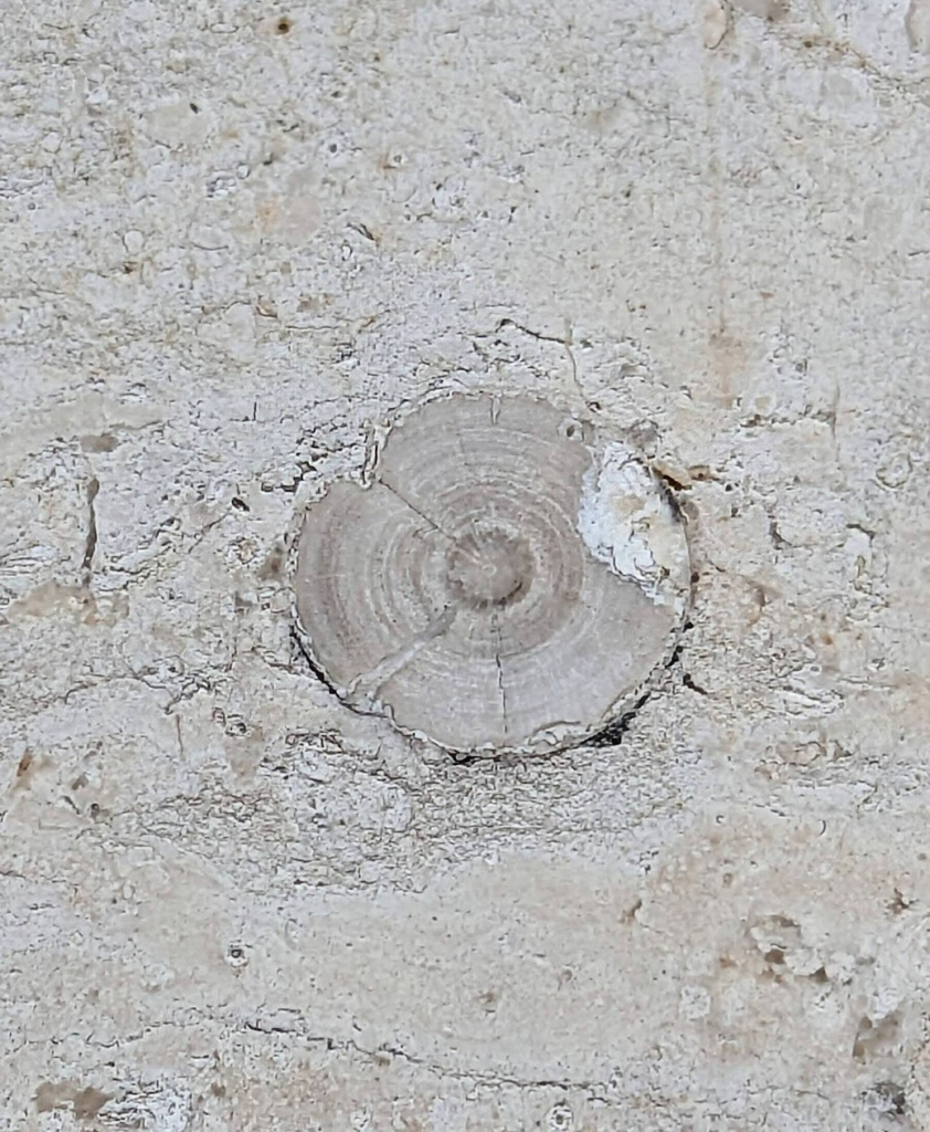 アンモナイトの縦切りの断面が、特に柾目の石材部分で多かったです。