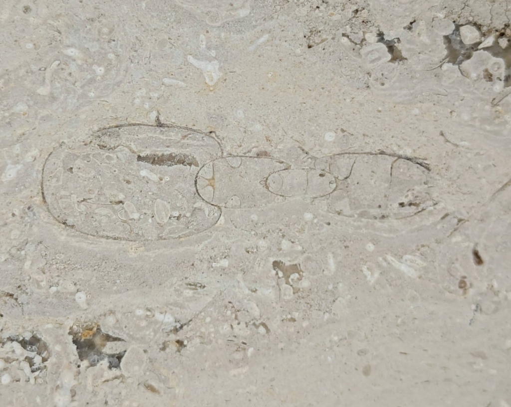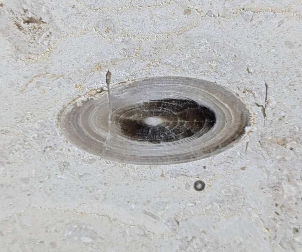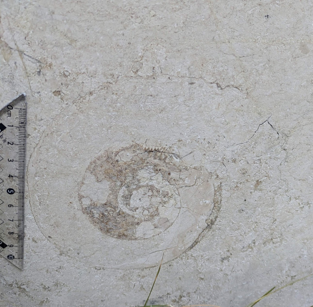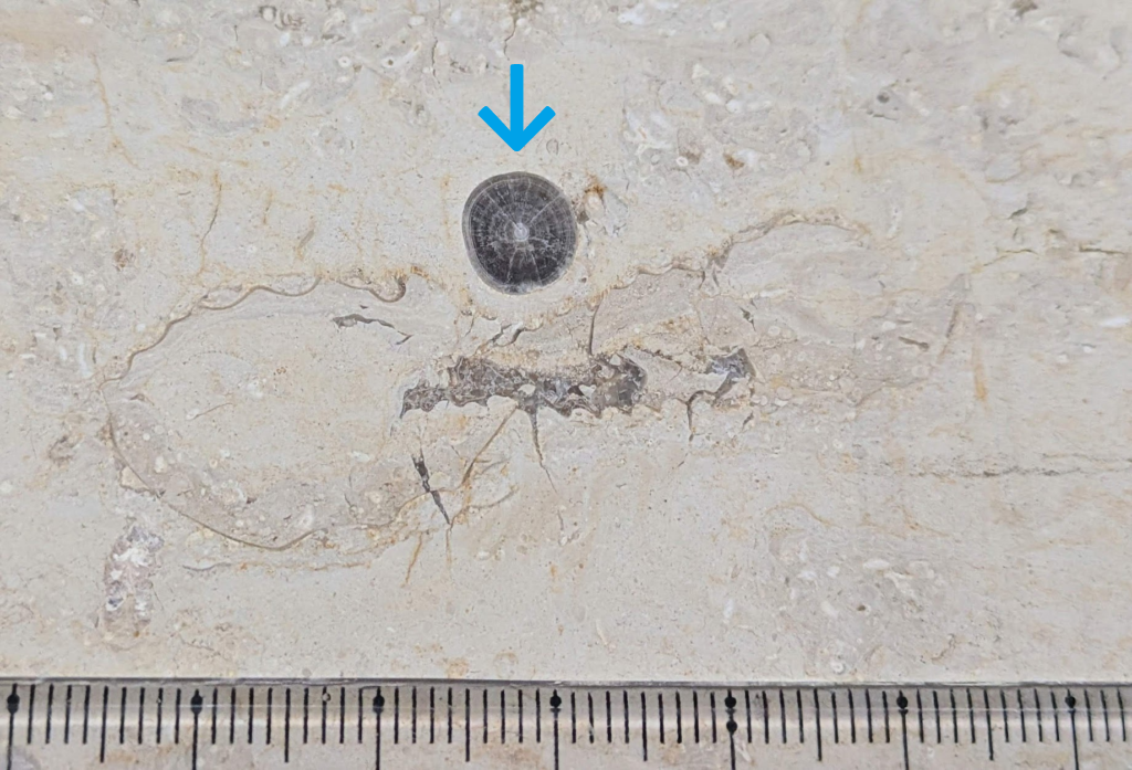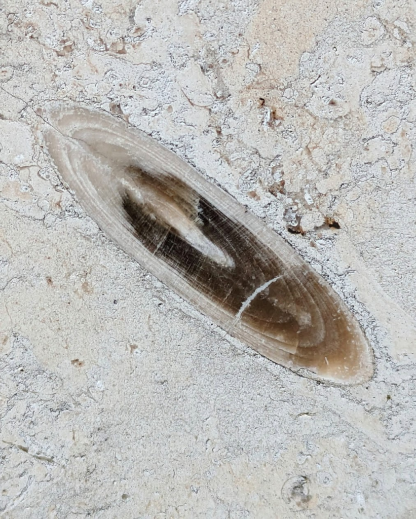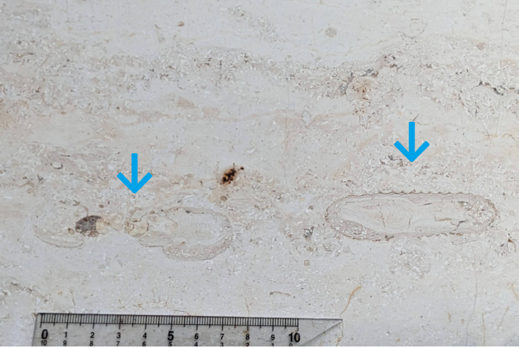 アンモナイトの縦切りの断面が、特に柾目の石材部分で多かったです。