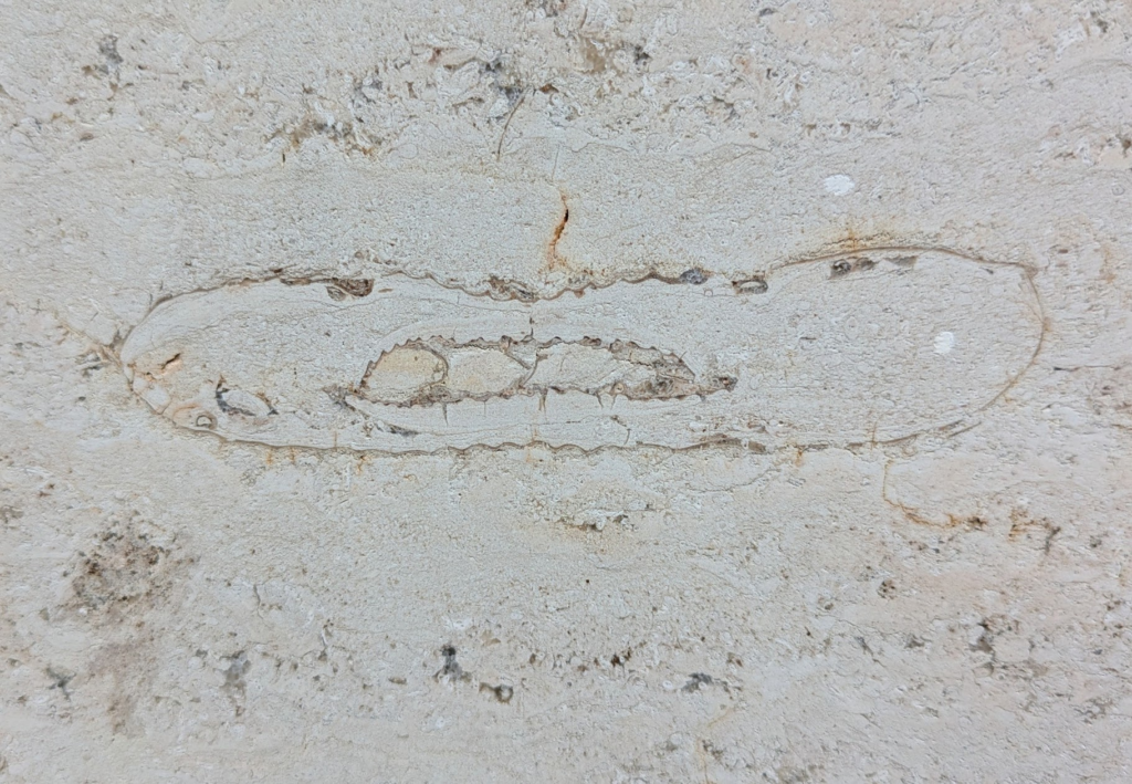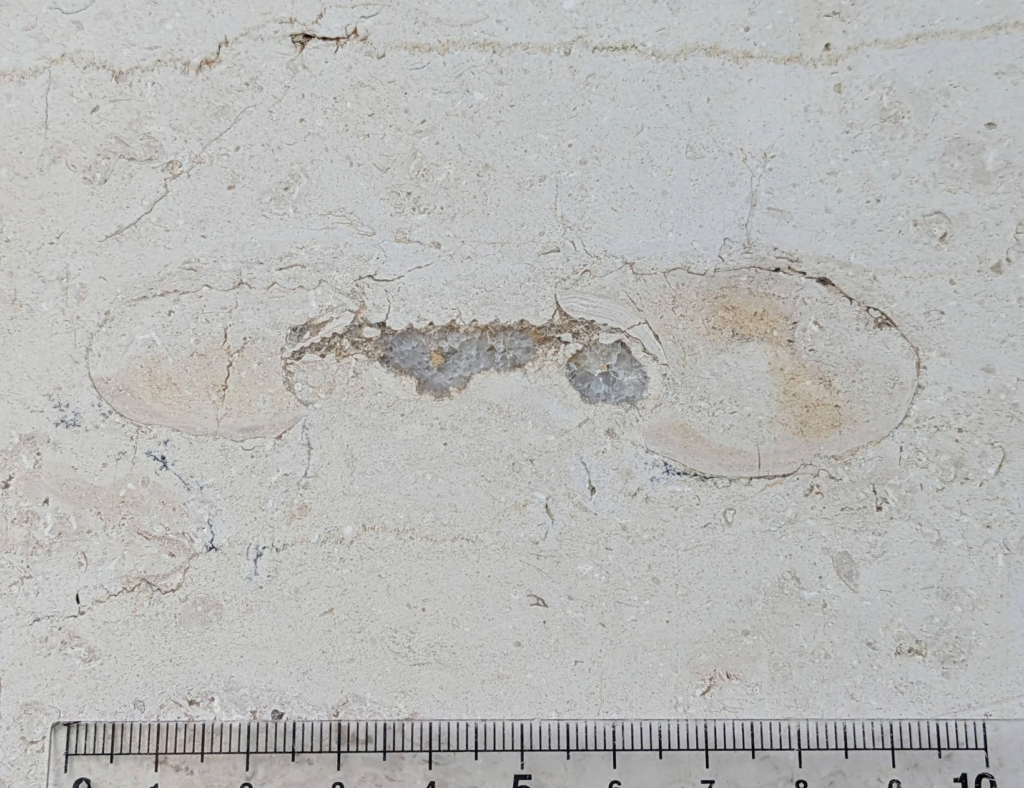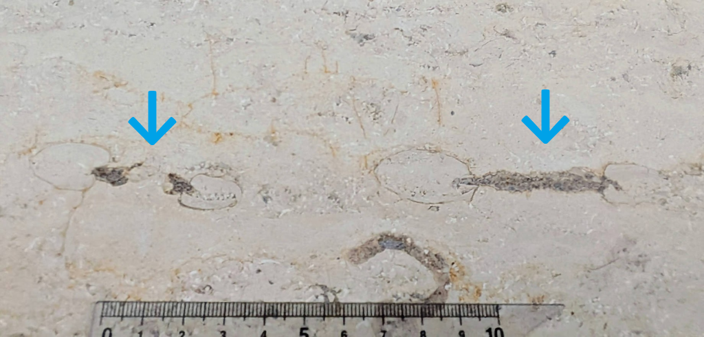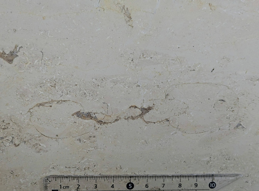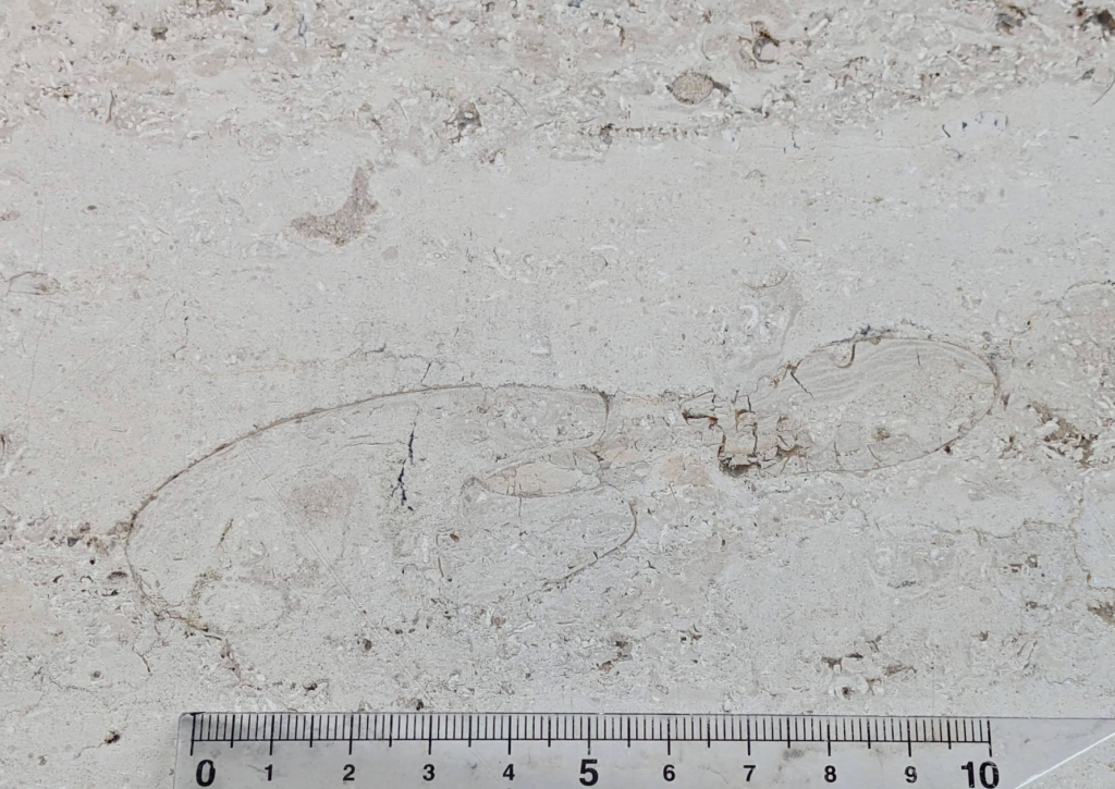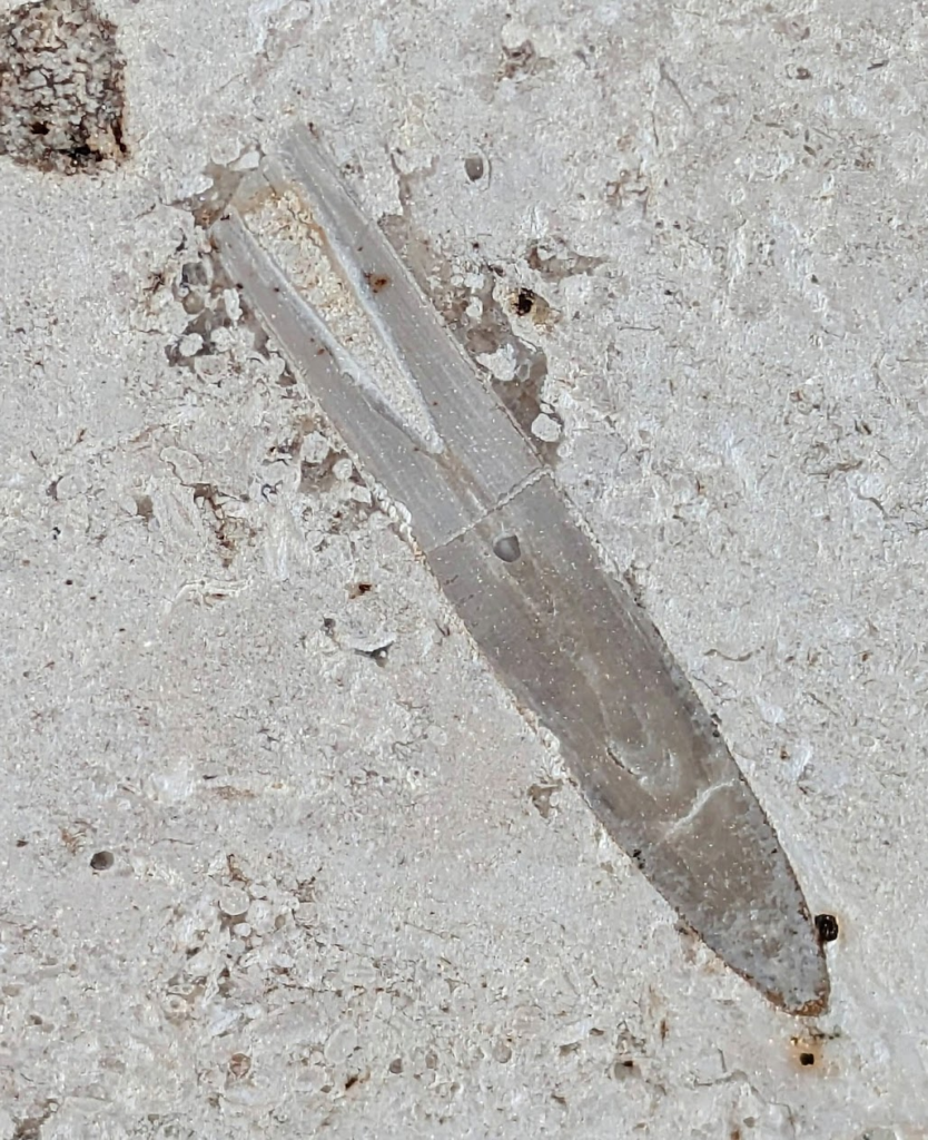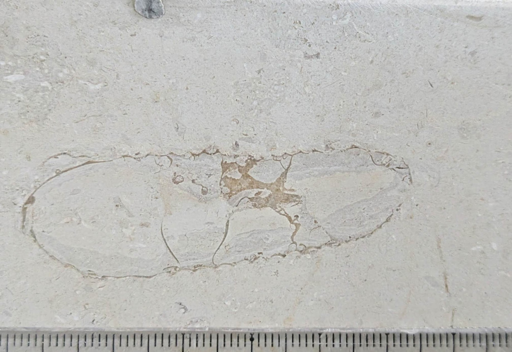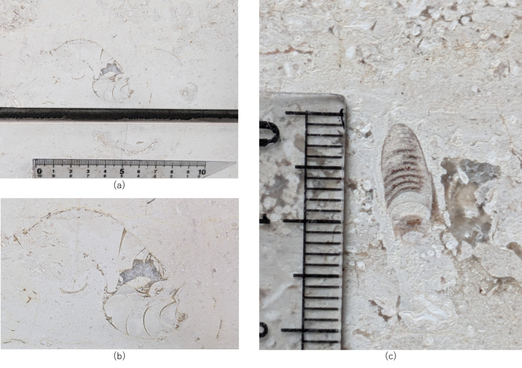 (a)は途中で破損したのかねじれたような形の化石ですが、拡大して見ると隔壁の様子からオウムガイでは…と思いました(b)。