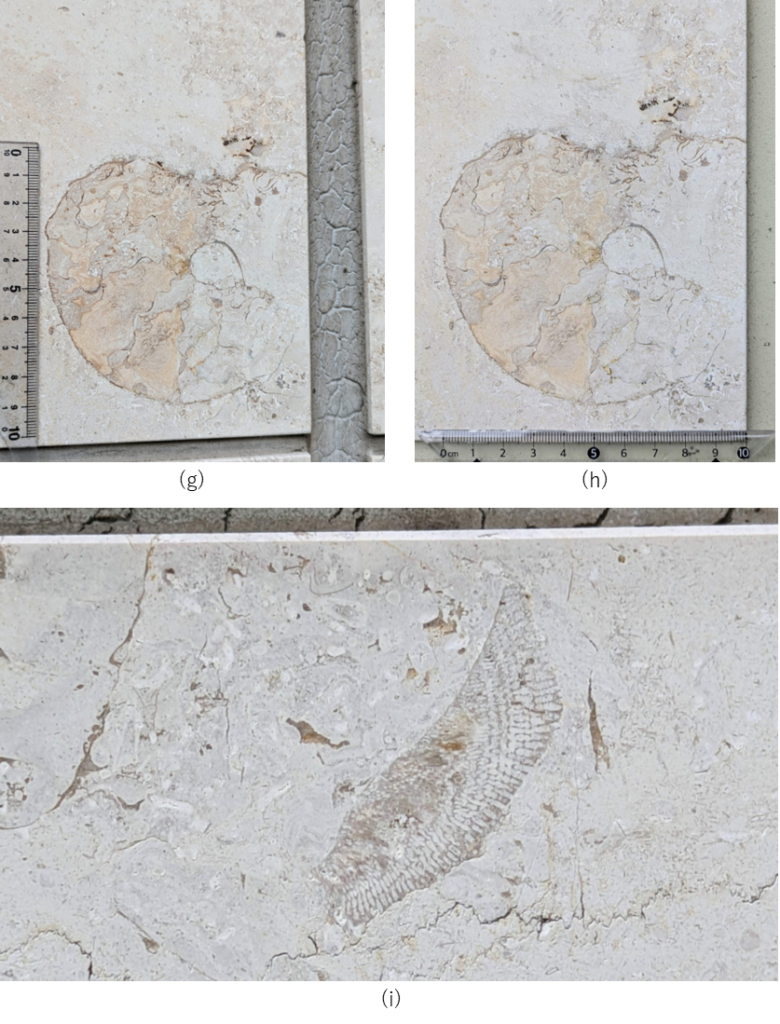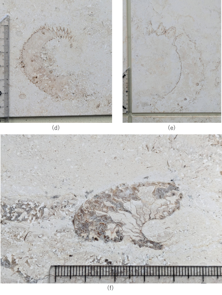(f)はアンモナイトの螺環(巻いている部分)の殻内部の縫合線が見えているのだと思いますが、椎茸の傘の裏のヒダに似ている…という感想を𝕏のフォロワー様より頂きました😄連想するのも楽しい🤭