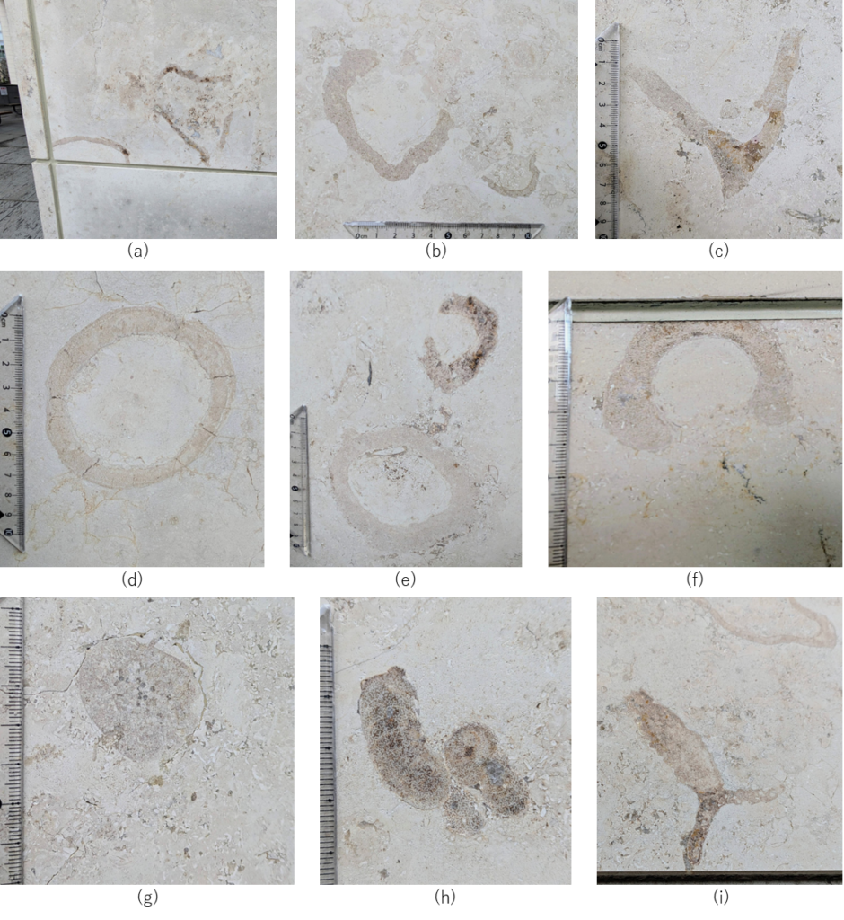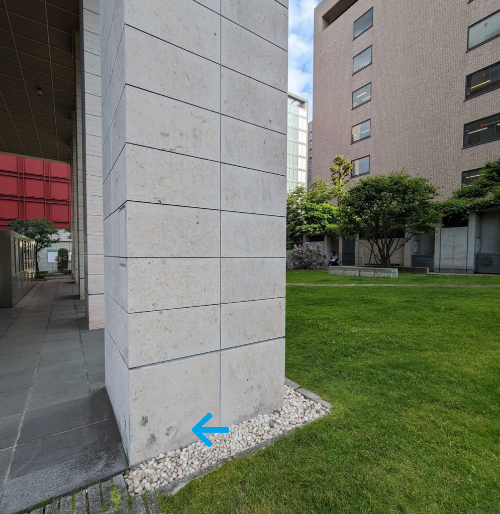 「二松学舎大学」の千代田区三番町にある九段1号館の外壁には、ドイツ産大理石ジュライエロー(ジュラマーブルイエロー)が使われていて化石も多数含まれています。