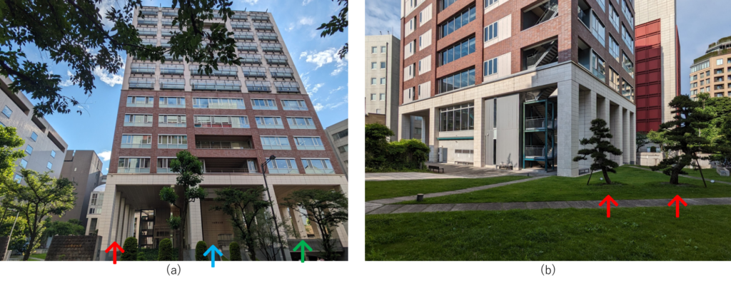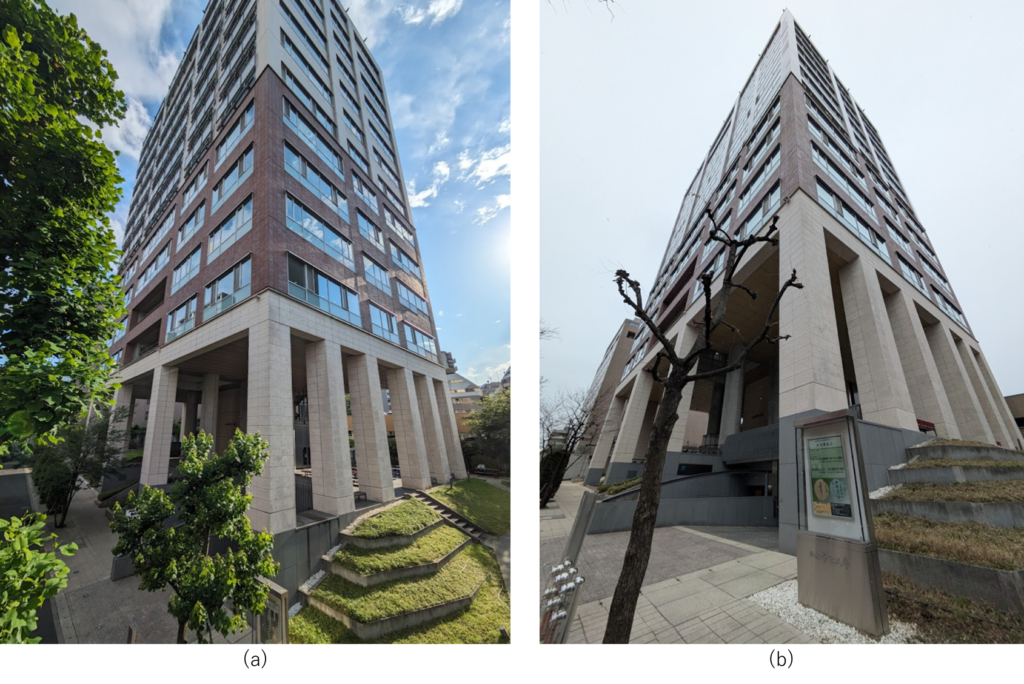 (a)は道路対岸から見た様子です。(b)は芝生の貼られた庭から建物と道路方向を見た様子です。