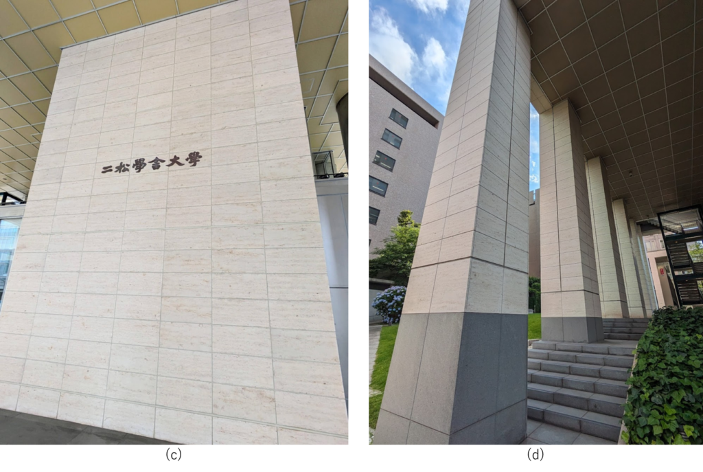 1階部分の建物を支える柱にジュライエロー石材が使われています。(b)のは、学問の場の象徴として植えられた二本の松だそうです。