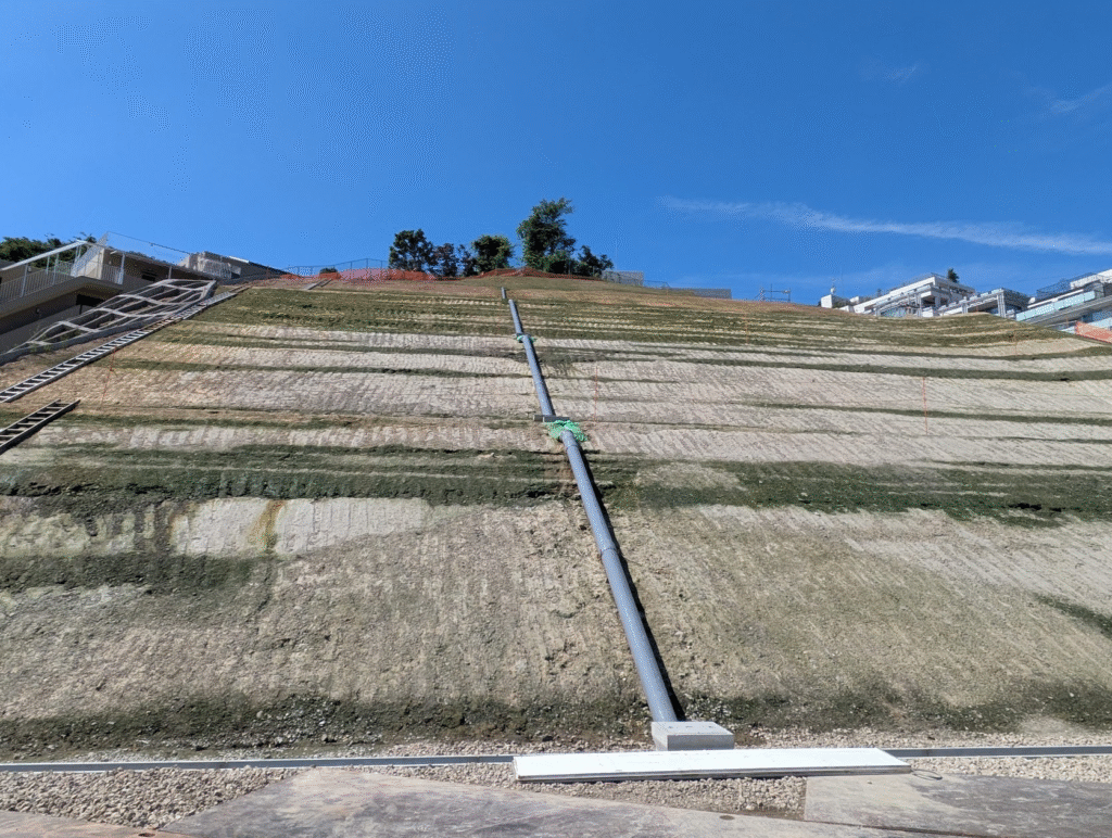 崩落止めのために、基盤材と植物の種が吹き付けられ、抹茶ケーキのようなストライプ模様の見た目に👀