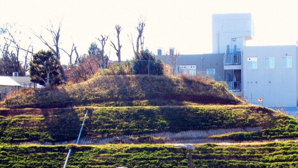 久本一丁目にある史跡スポットです。急斜地の防護壁の奥には横穴墓が存在しているそうです。久本神社の裏側の斜面です。